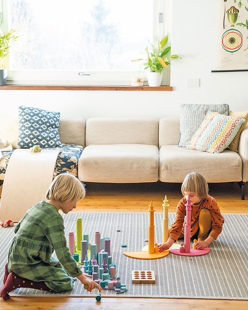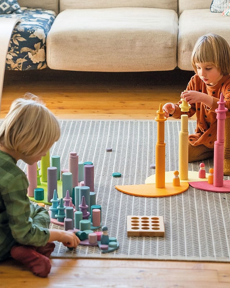 Welcome to Grimm's, a world where fantasy and sustainability live happily together. Founded in 1978, Grimm's Spiel und Holz Design is a family-owned company based in Hochdorf, Germany, producing lovely wooden toys and fabric dolls with an old-fashioned charm that appeal to kids of all ages: beautiful rattles and grasping toys, building blocks, creative puzzles, play dolls and pegs, skillful games and many others, all characterized by simple design, cheerful colouring, and inviting surface feel. Most of them are sanded by hand, which gives them a complete different look and touch from machined products! Design work, surface finish and treatment, assembly, quality control, packing and shipping are made in Germany while woodworking is outsourced to a few independent shops in Europe. The larger one was opened by a former Grimm's employee who went back to is native country. Grimm's love kids and nature: the wood used for Grimm's toys comes from sustainably managed forests in Europe and all fabrics used are Oeko-Tex certified, a guarantee that they're free from harmful chemical substances. Safe, eco-friendly and beautiful, Grimm's toys are unique products that are played with over and over again, enhancing your child's creativity and motor skills.