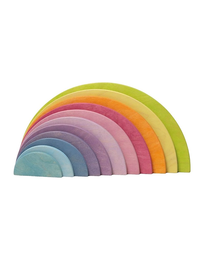 There's nothing like a rainbow to add happiness and colour to your child's growth! Bring one home with the lovingly made Wooden Toy Large Semicircles Rainbowcolours by German brand Grimm's. This fantastic wooden rainbow is made of 12 blocks that can be used in a myriad of different ways: fun will never end! Toddlers will stack, sort and build and later on they will use the blocks to create bizarre shapes and sculptures or whatever their fantasy will inspire them! This is a fun toy that enhances your little one's creativity and motor skills while respecting the environment: the wood used comes from sustainable forests and finished with water-based colours that are completely free from chemical harmful substances. Each piece is absolutely one of a kind as the natural finish allows the grain of the wood to shine through, making your child's wooden rainbow different from any other.