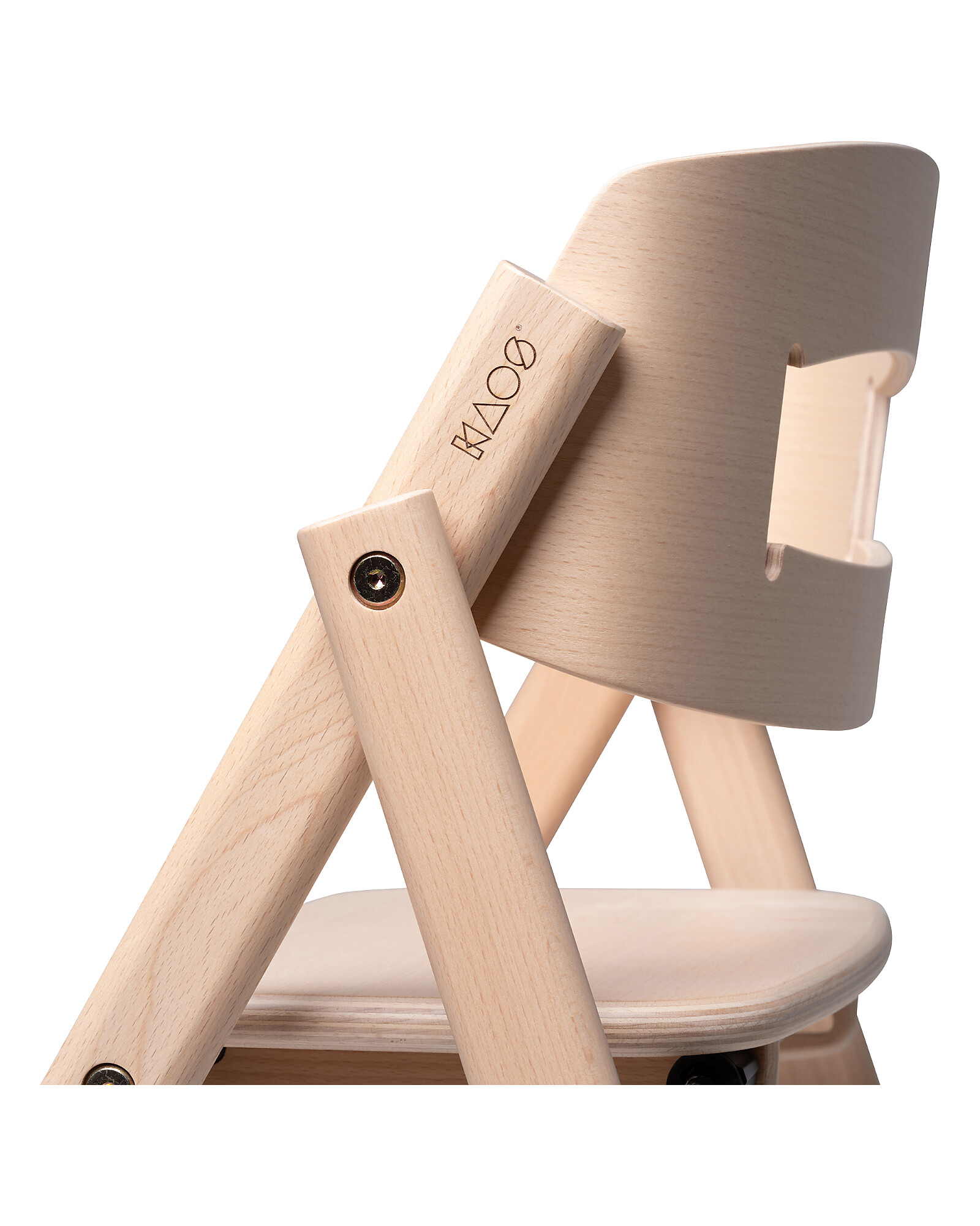 The KLAPP evolving high chair by KAOS combines elegant design with smart functionality. Made of FSC-certified premium wood, it offers a solid and sustainable structure. Its architectural, ladder-inspired design allows for an ergonomic seating position, with fixed steps that enable the child to climb up and down independently, fostering a sense of autonomy. The KLAPP comes fully assembled: simply open it, lock the seat, and it’s ready to use with no adjustments needed. It folds in seconds to a thickness of just 13 cm, making it ideal for small spaces or for travelling. It has a high weight capacity, allowing it to accompany the child from infancy through adulthood. The smooth surfaces are easy to clean with a cloth. The high chair is certified according to the highest standards, ensuring safety and quality.