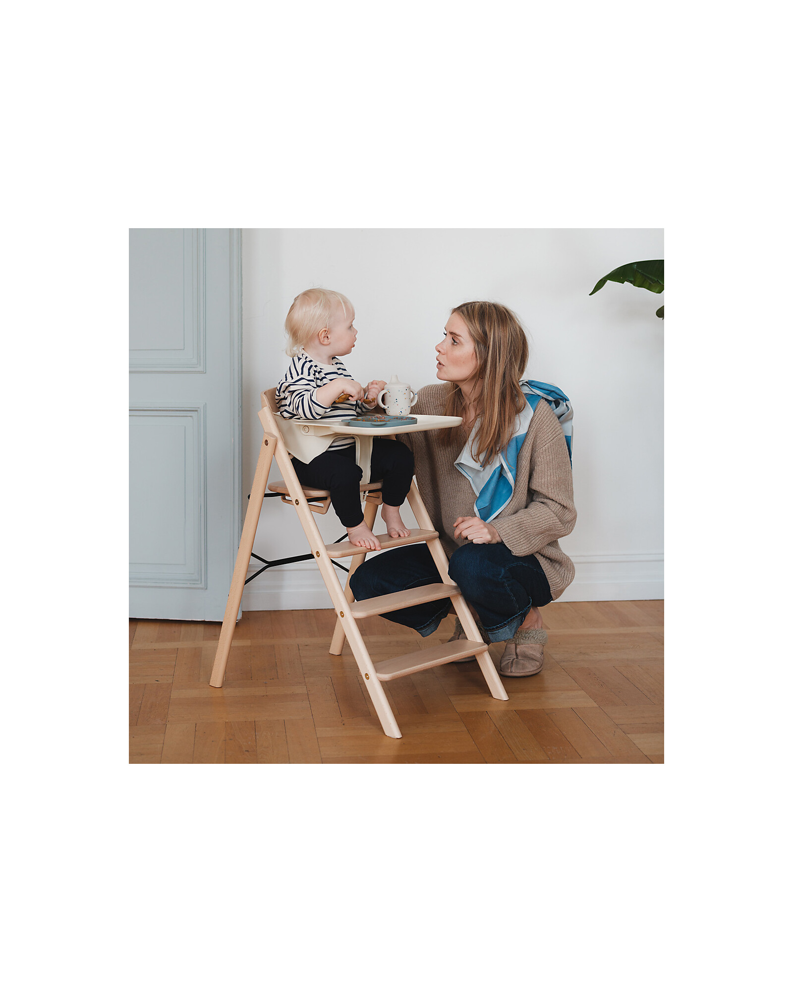 The KLAPP evolving high chair by KAOS combines elegant design with smart functionality. Made of FSC-certified premium wood, it offers a solid and sustainable structure. Its architectural, ladder-inspired design allows for an ergonomic seating position, with fixed steps that enable the child to climb up and down independently, fostering a sense of autonomy. The KLAPP comes fully assembled: simply open it, lock the seat, and it’s ready to use with no adjustments needed. It folds in seconds to a thickness of just 13 cm, making it ideal for small spaces or for travelling. It has a high weight capacity, allowing it to accompany the child from infancy through adulthood. The smooth surfaces are easy to clean with a cloth. The high chair is certified according to the highest standards, ensuring safety and quality.