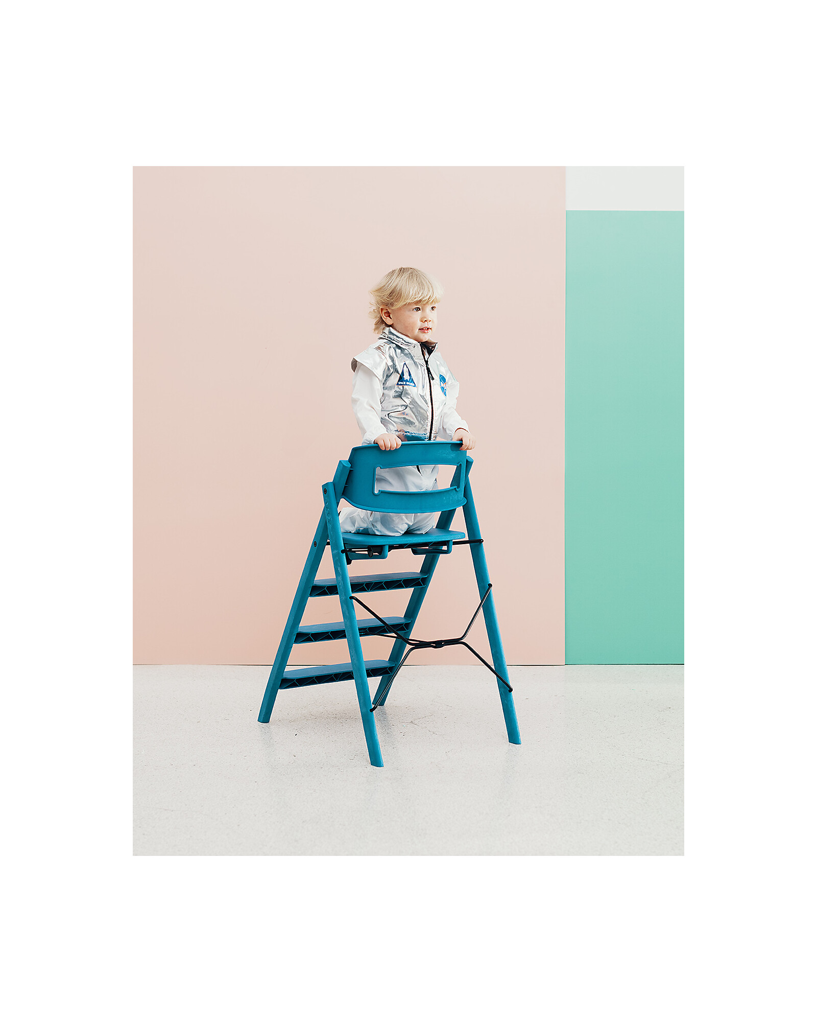 The KLAPP evolving high chair by KAOS combines elegant design with smart functionality. Made of 100% recycled materials, it offers a solid and sustainable structure. Its architectural, ladder-inspired design allows for an ergonomic seating position, with fixed steps that enable the child to climb up and down independently, fostering a sense of autonomy. The KLAPP comes fully assembled: simply open it, lock the seat, and it’s ready to use with no adjustments needed. It folds in seconds to a thickness of just 13 cm, making it ideal for small spaces or for travelling. It has a high weight capacity, allowing it to accompany the child from infancy through adulthood. The smooth surfaces are easy to clean with a cloth. The high chair is certified according to the highest standards, ensuring safety and quality.