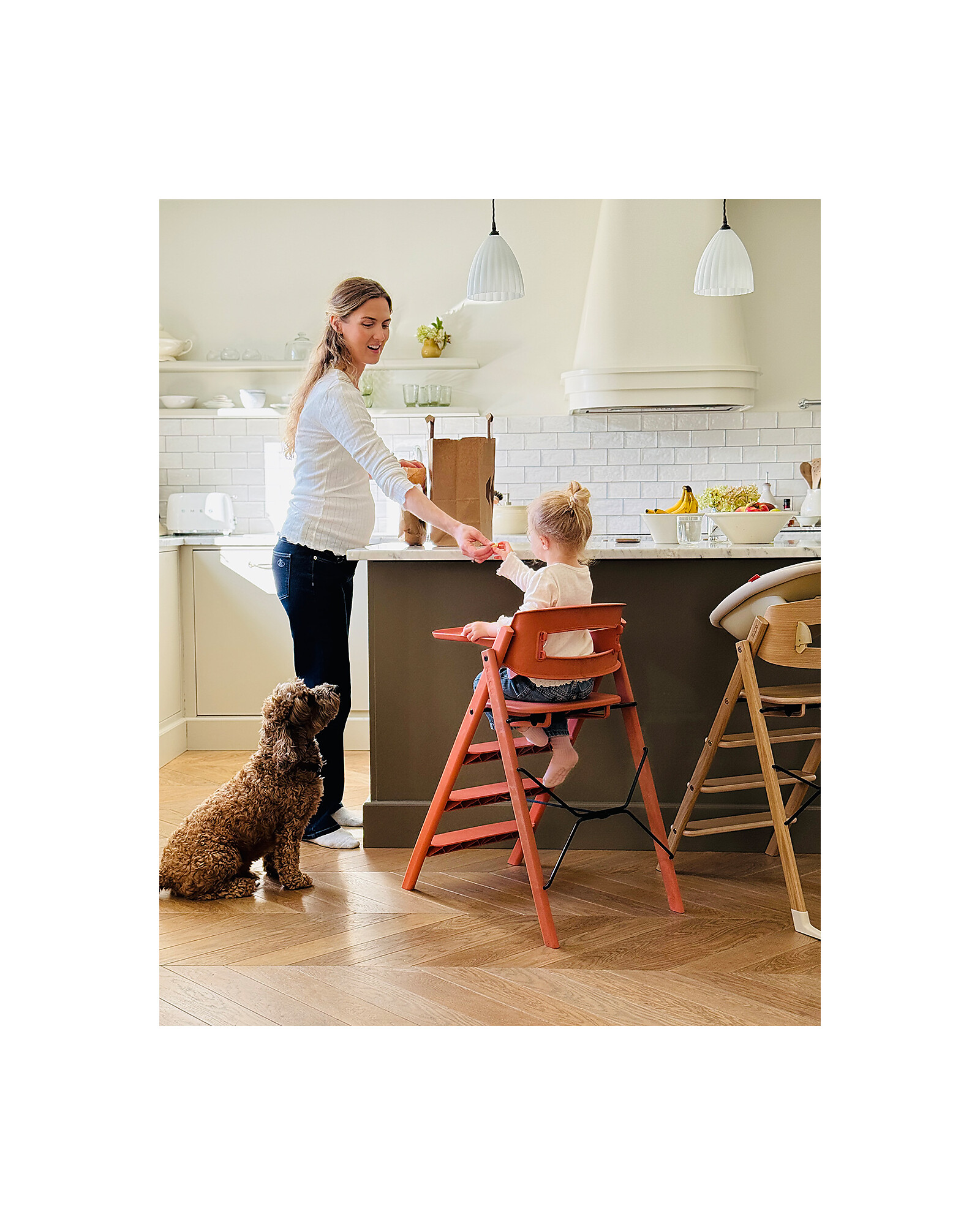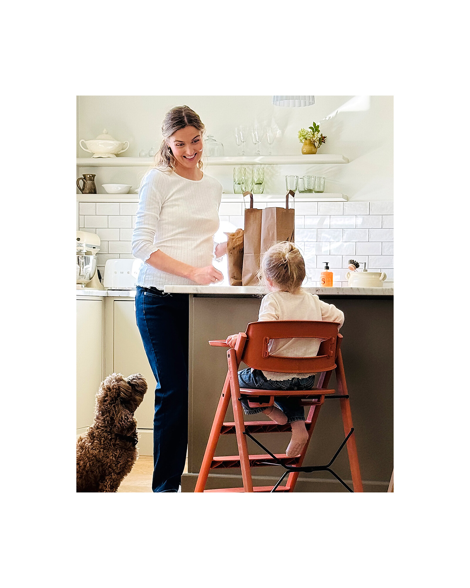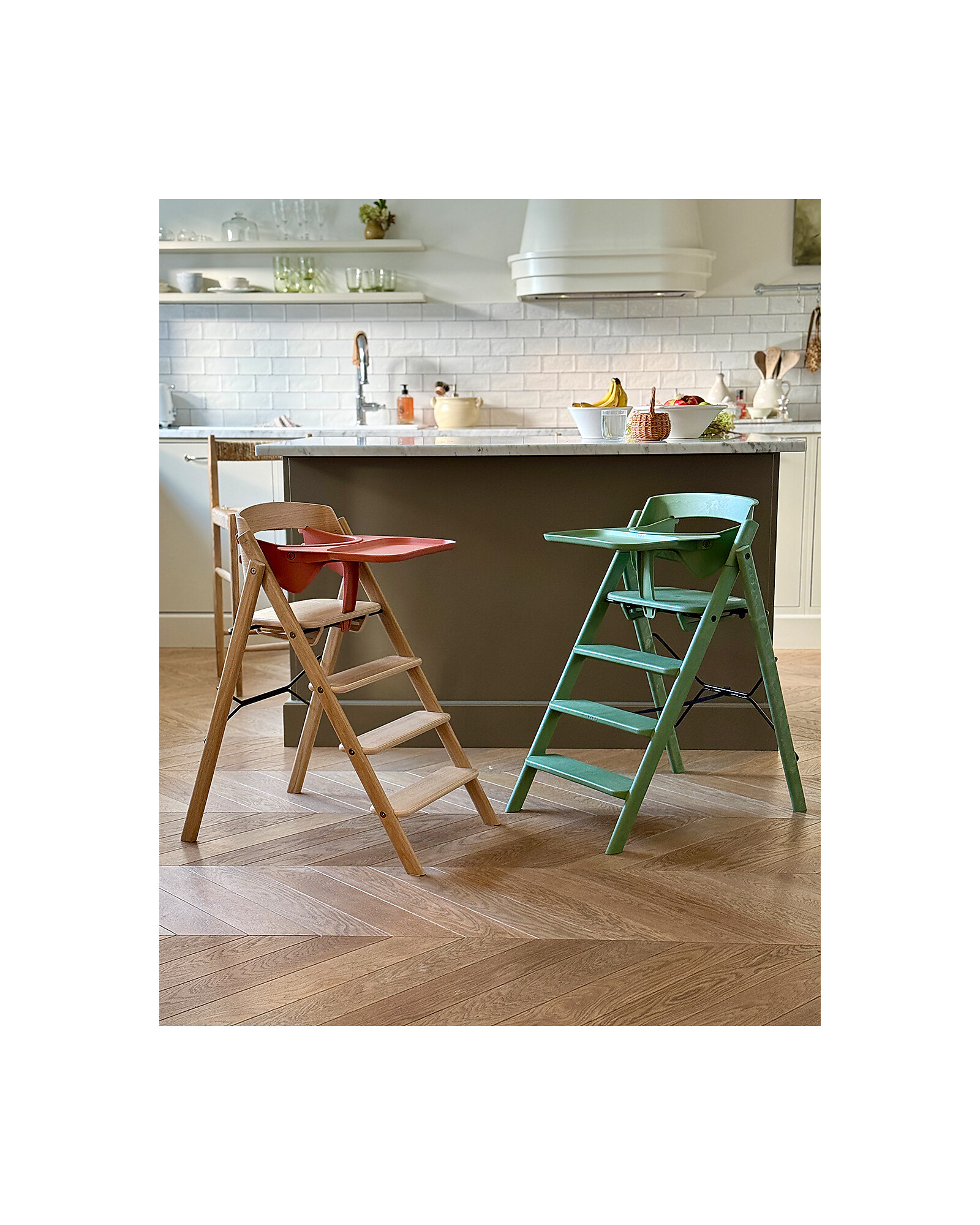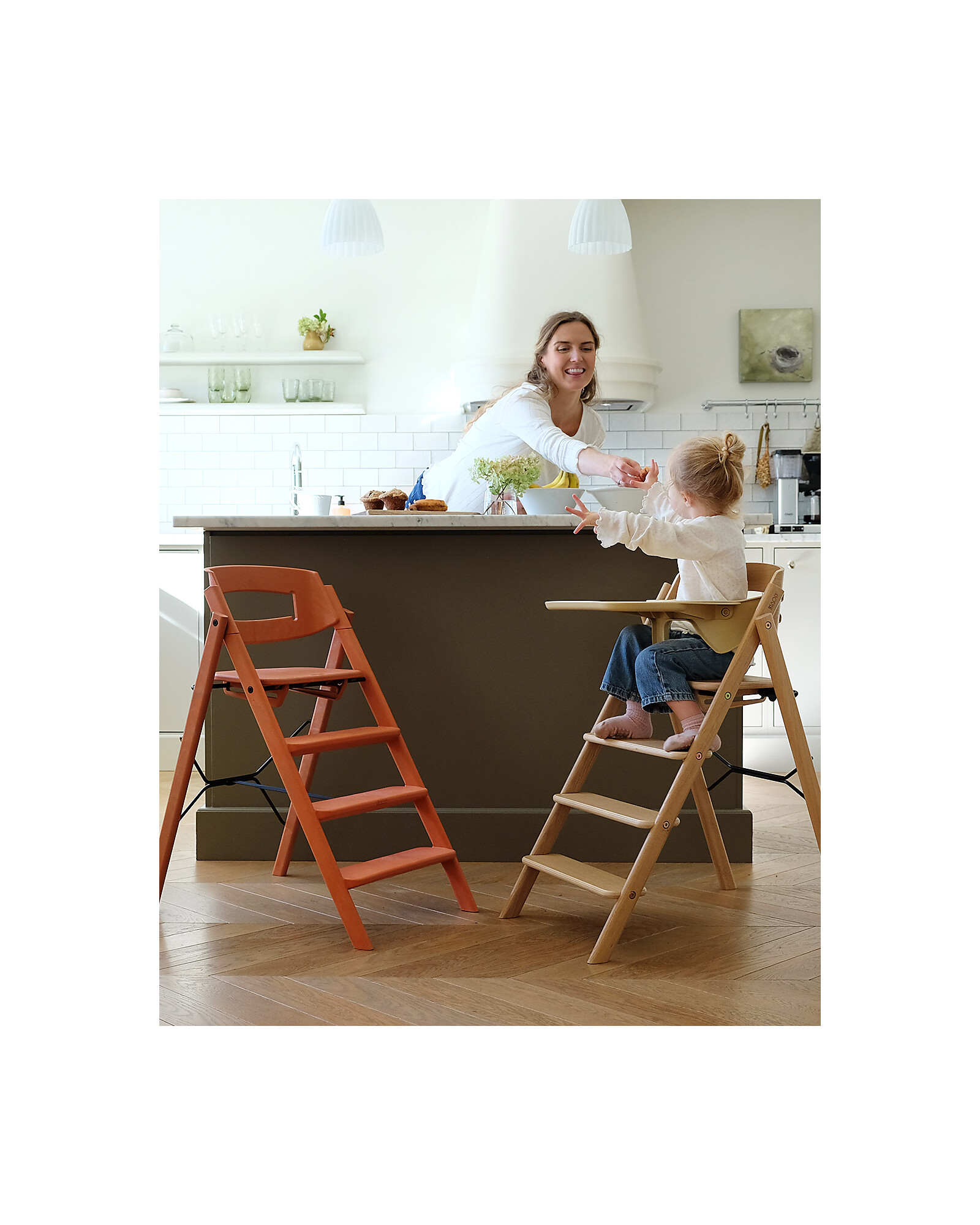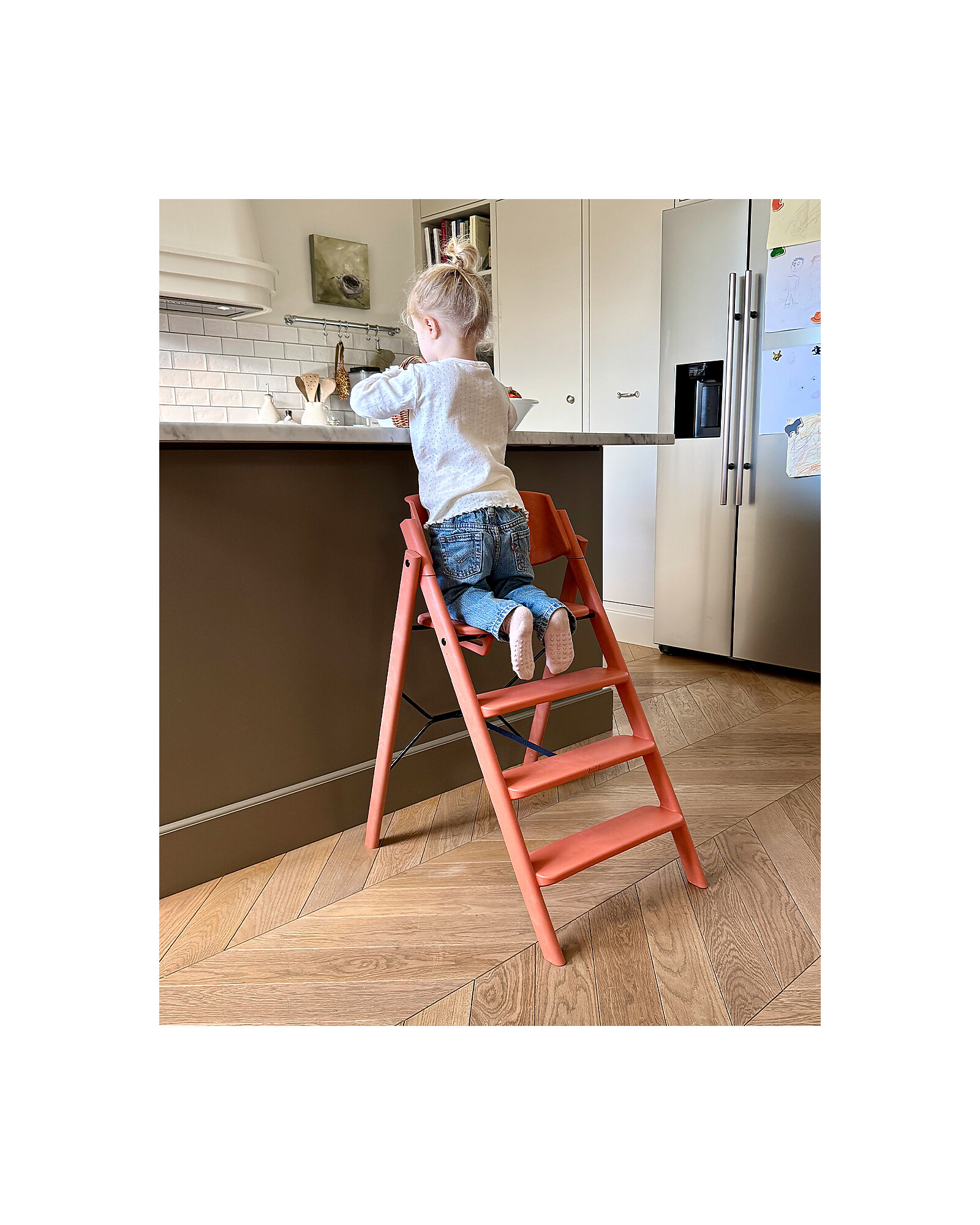 The KLAPP evolving high chair by KAOS combines elegant design with smart functionality. Made of 100% recycled materials, it offers a solid and sustainable structure. Its architectural, ladder-inspired design allows for an ergonomic seating position, with fixed steps that enable the child to climb up and down independently, fostering a sense of autonomy. The KLAPP comes fully assembled: simply open it, lock the seat, and it’s ready to use with no adjustments needed. It folds in seconds to a thickness of just 13 cm, making it ideal for small spaces or for travelling. It has a high weight capacity, allowing it to accompany the child from infancy through adulthood. The smooth surfaces are easy to clean with a cloth. The high chair is certified according to the highest standards, ensuring safety and quality.