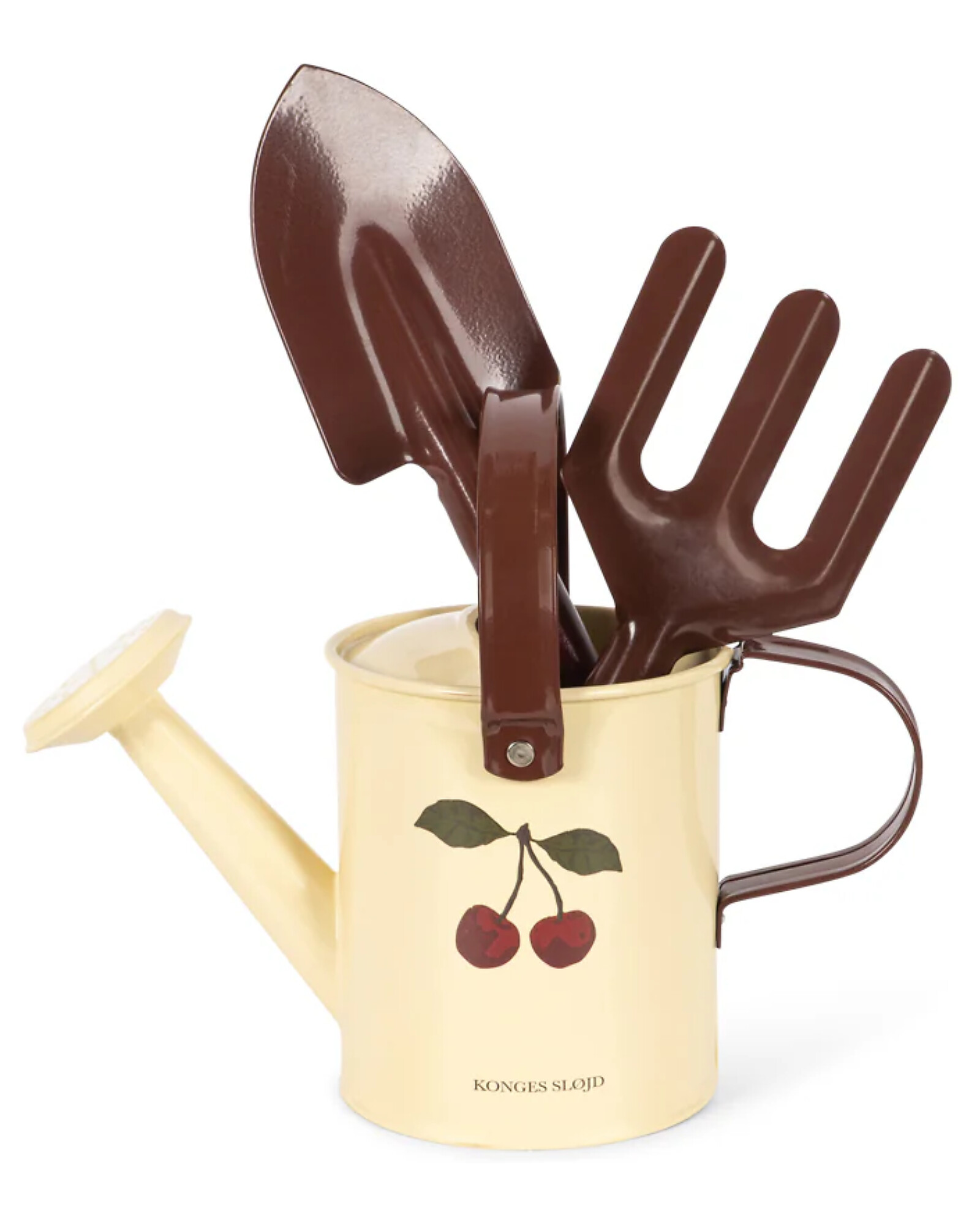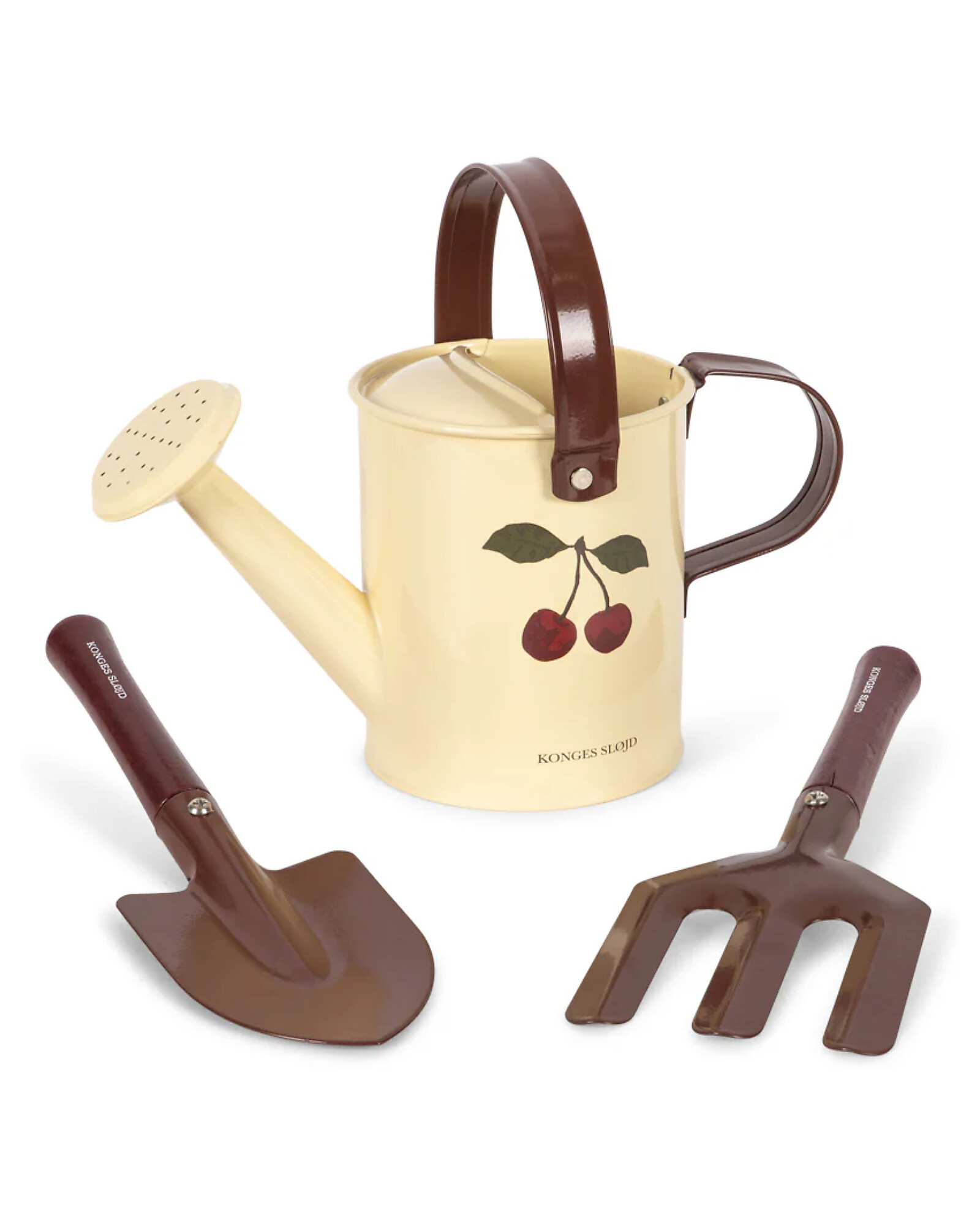 - The set includes: Watering can, rake, and shovel