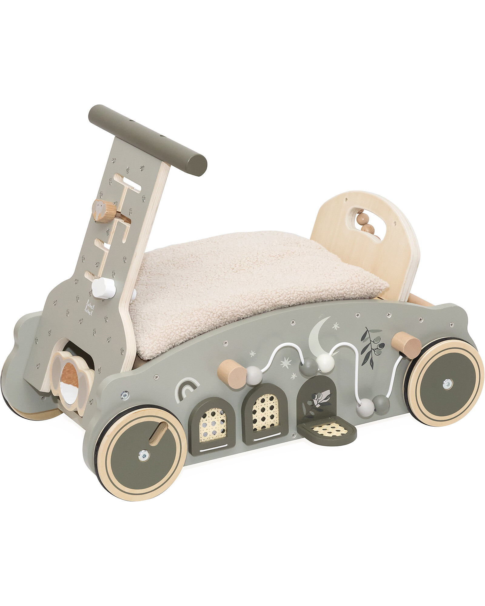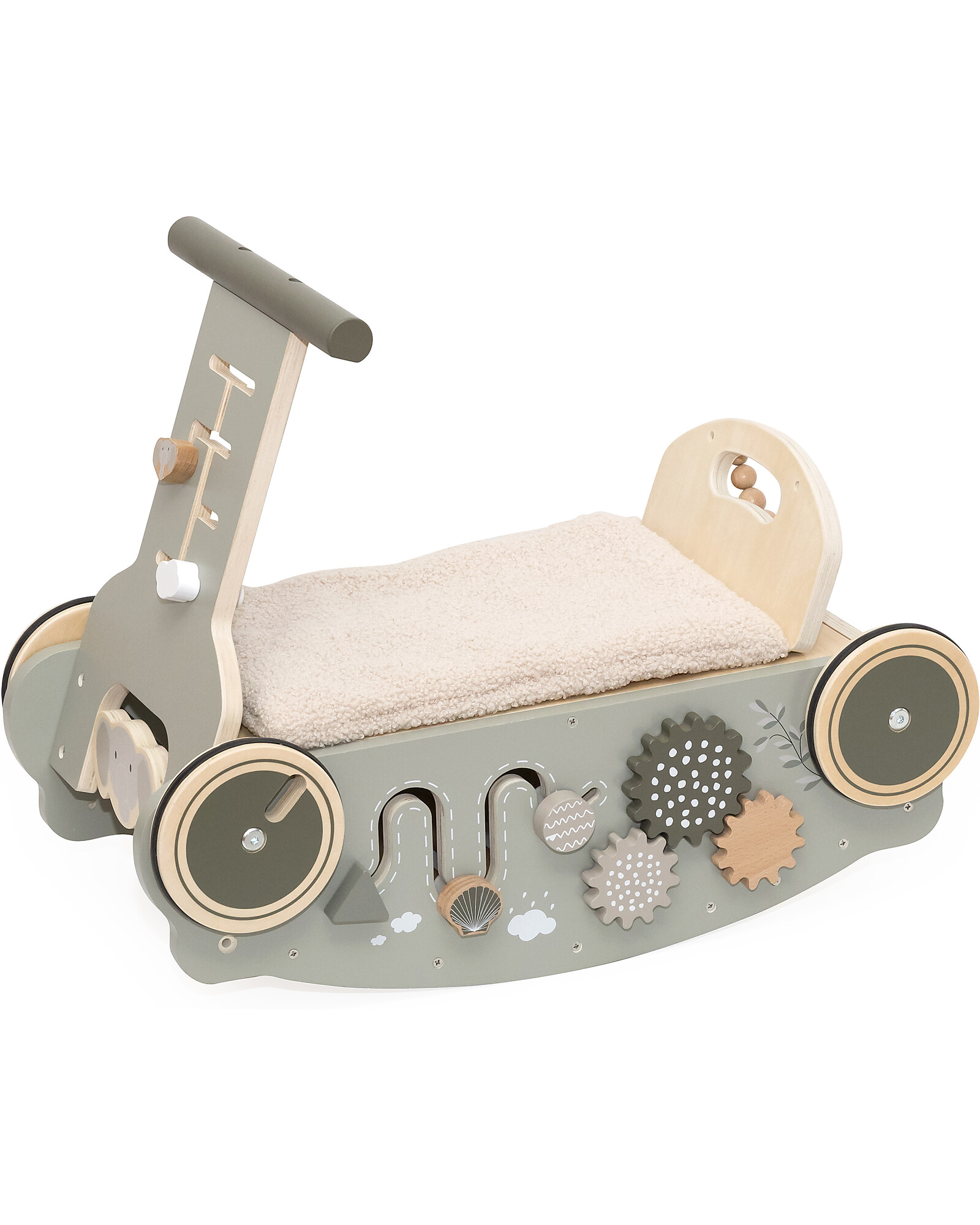 A companion for adventure that grows with your child. This multifunctional wooden toy combines design, fun, and discovery, transforming from a rocker to a ride-on and activity center. Every detail is designed to stimulate senses, motor skills, and curiosity, offering endless play possibilities. Its solid structure and refined finishes make it a safe and cozy choice, ideal for little explorers. Perfect for moments of quiet play or active fun, always inspired by imagination and learning.
