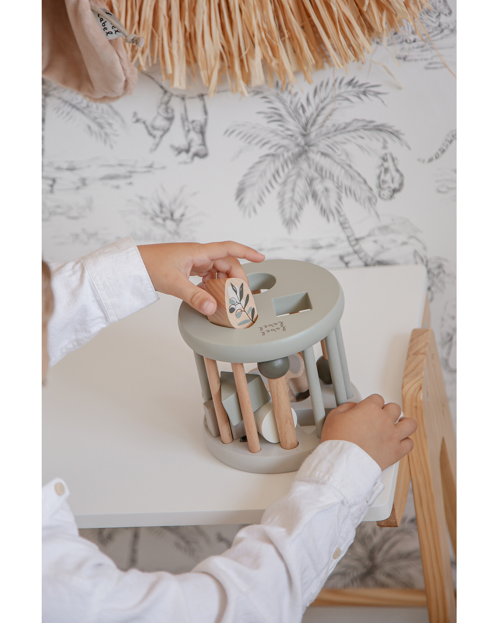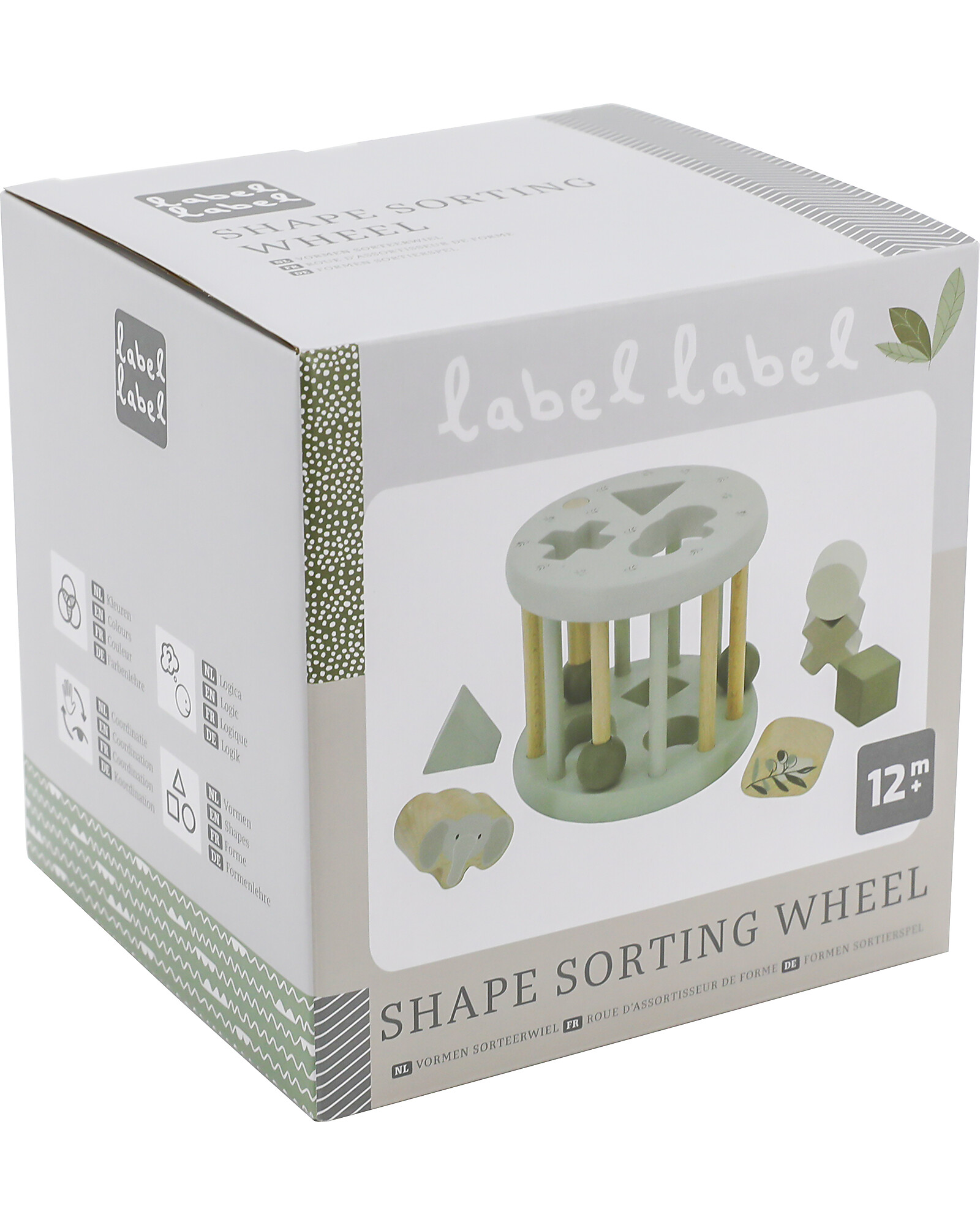 The Label Label Shape Sorting Wheel – Olive – is the perfect toy to stimulate shape and color recognition in children from 12 months onward. Made from FSC-certified beech wood and painted with child-safe water-based paints, this shape-sorting wheel helps develop hand-eye coordination, concentration, and cognitive skills in a safe and fun way.With compact dimensions of 14.8 x 14.8 x 13.4 cm, it is ideal for little hands and fits easily into any nursery or play area thanks to its elegant olive color.