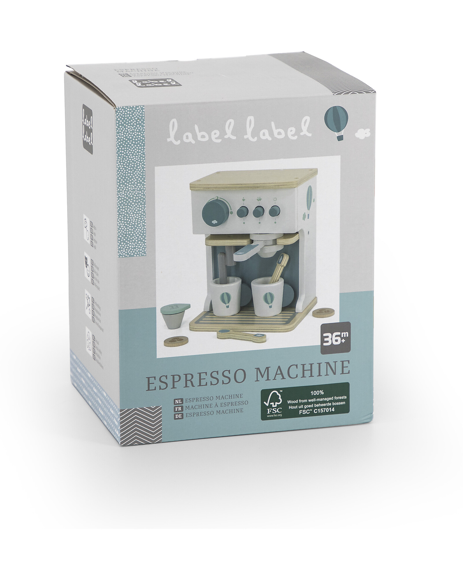 The Wooden Espresso Machine is an educational and fun game designed for children aged 36 months and up. Made from FSC-certified beech wood, it ensures quality, sustainability, and safety. The water-based paints used for the finish are non-toxic and safe for little ones. This wooden coffee machine encourages imaginative play and creativity, offering children a fun way to imitate adults and develop manual skills.