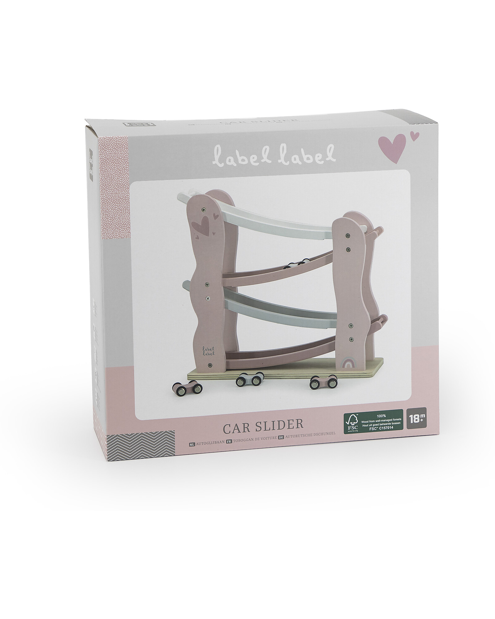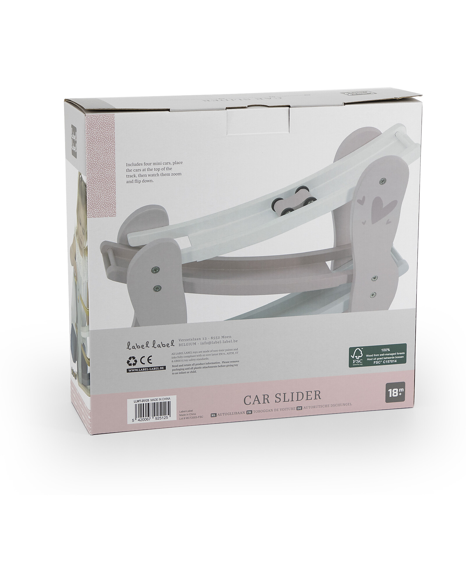 This entertaining car slide by Label Label is crafted from quality FSC-certified beechwood and painted with child-safe water-based paint. The car slide comes with 4 cars in matching colors, providing non-stop activity for your child. Place the car at the top of the slide and watch it zoom down, spinning! Or have a race among them! Fun is guaranteed while motor skills, coordination, and logical reasoning are stimulated.
