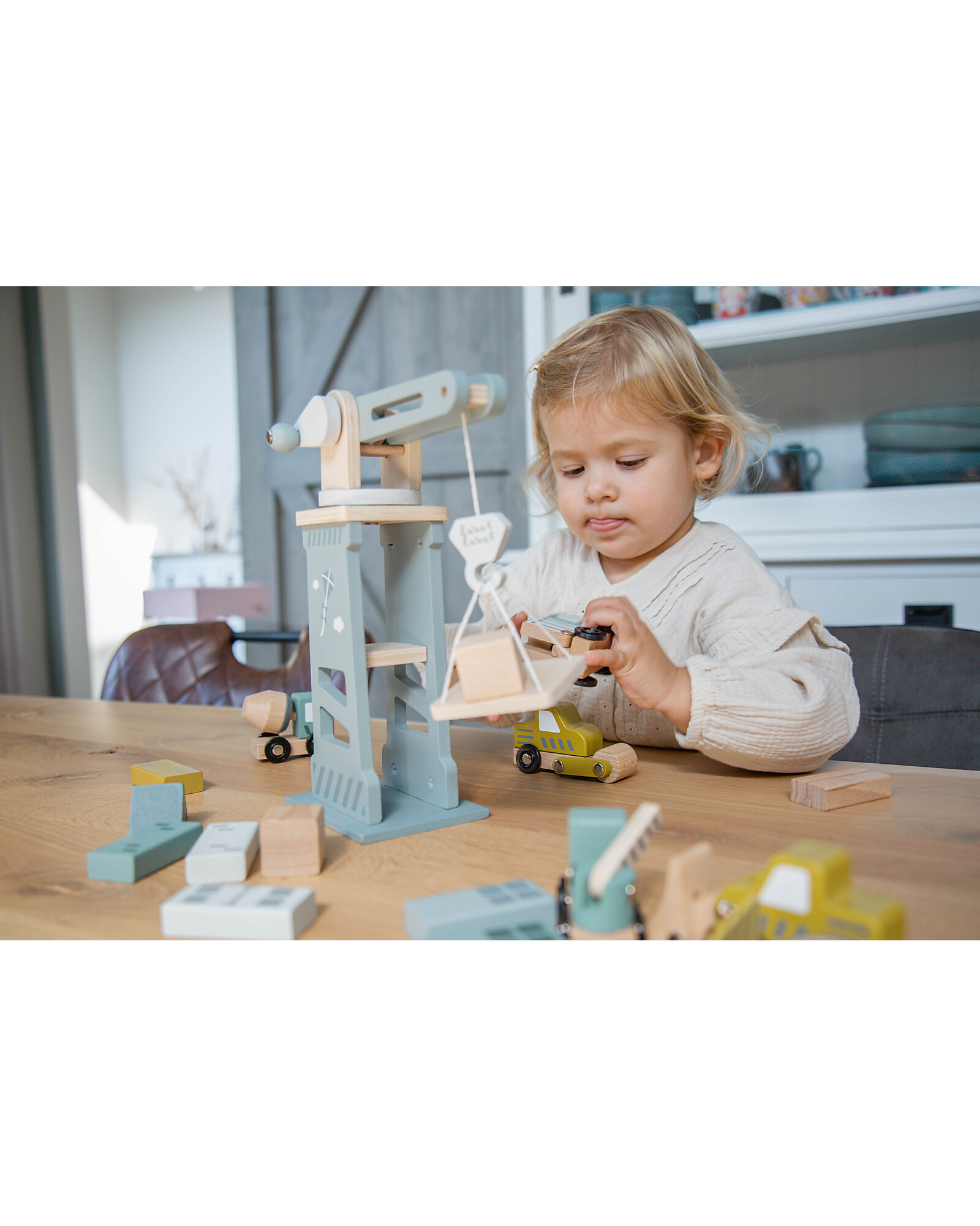 - Set includes: a crane, 6 construction vehicles, a pallet, 13 building blocks, and a road sign.