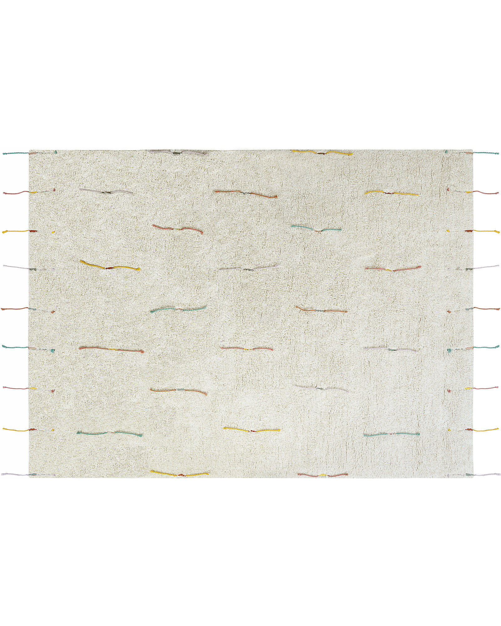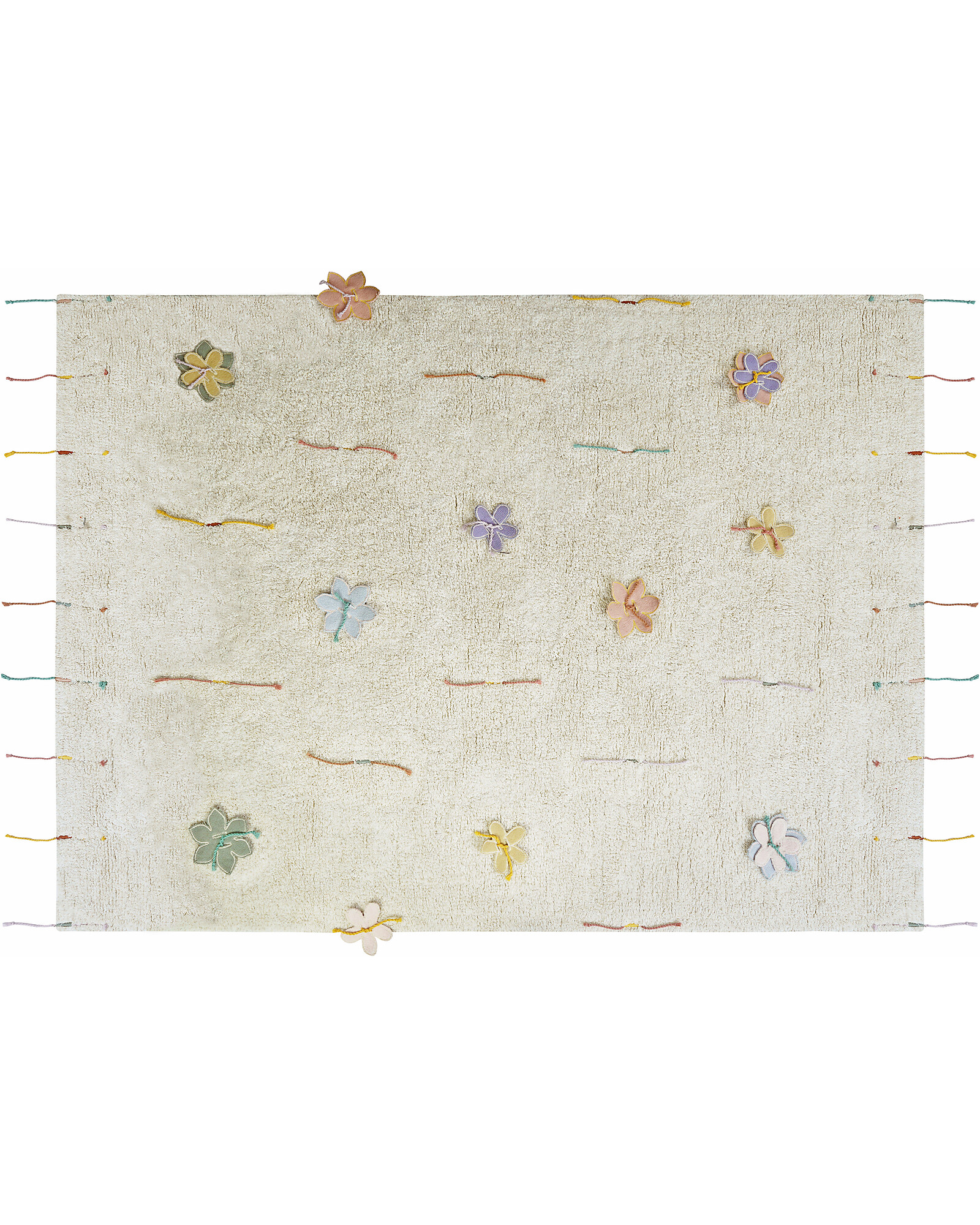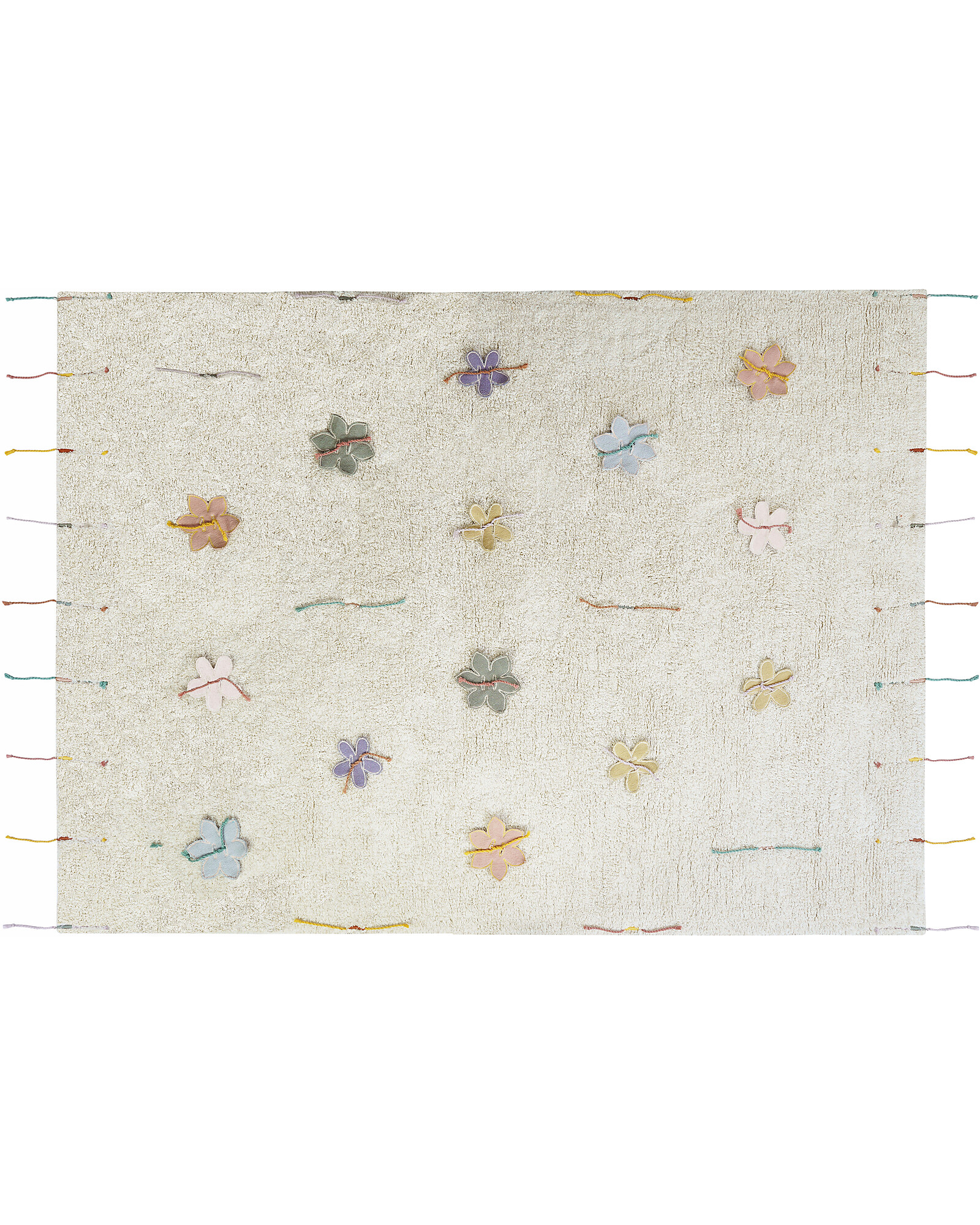 The play rug Wildflowers is an interactive play rug, where to attach and remove colorful flowers creating personalized patterns. The rug is tufted in a soft cotton-mix of natural and ivory shades, featuring embroidered colorful cords at the borders as fringes, as well as placed allover the rug in a symmetric pattern. The rug comes together with 14 shaped cotton canvas flowers, that can easily be knotted to the rugs using the colorful cords. Make your own pattern and create a unique combination!