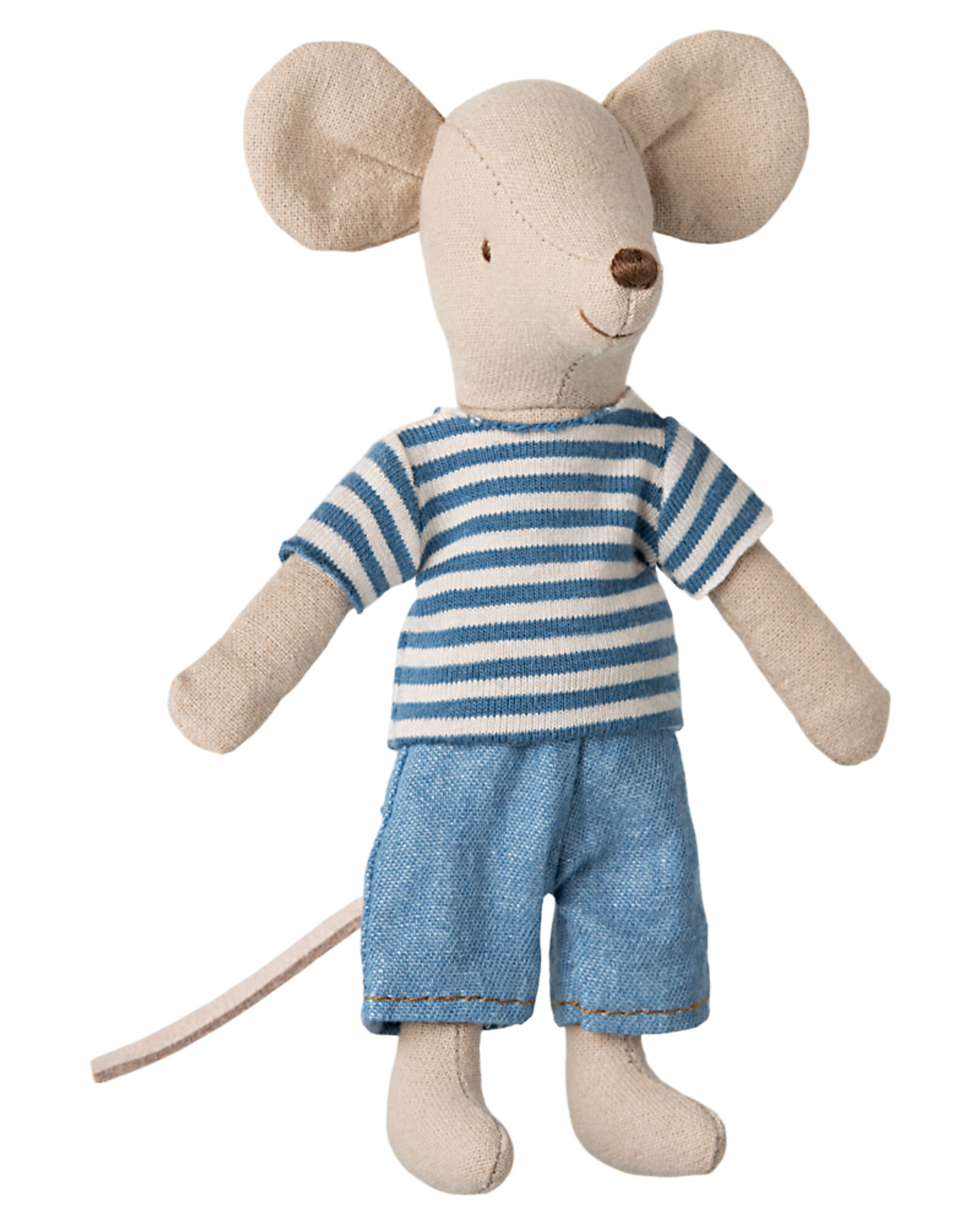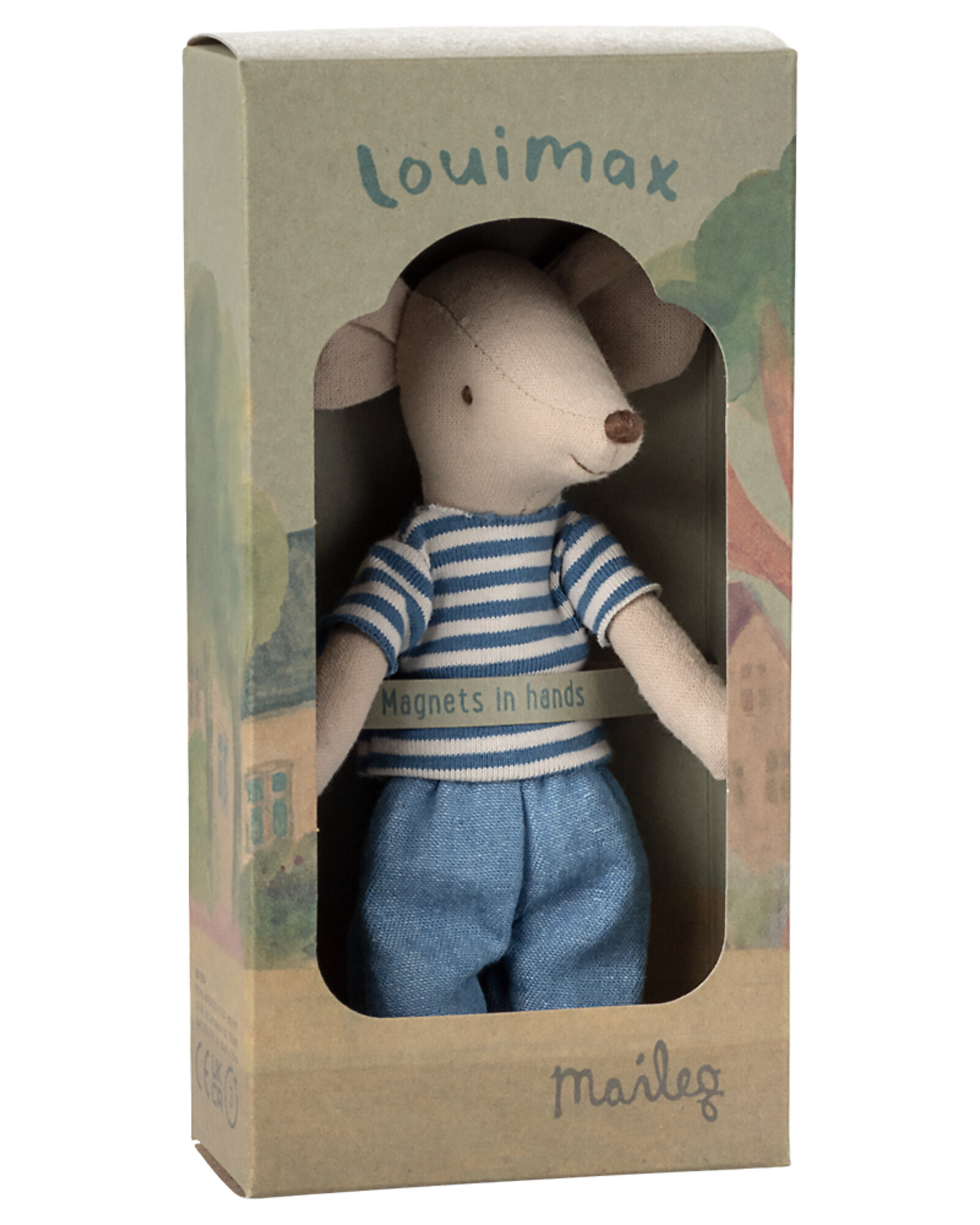 His name is LouiMax, and he's a little mouse with a big heart and an adventurous spirit, always ready to set off on a new journey. He proudly wears his blue striped shirt and trusty denim pants—faithful companions through countless escapades. Hidden in his hands is a touch of magic: tiny magnets that let him hug, cling, and hold on tight to those he loves. LouiMax comes in a beautifully designed decorative box, ready to become a special friend. He’s in the “big brother” size—perfect for sharing playtime and dreams.