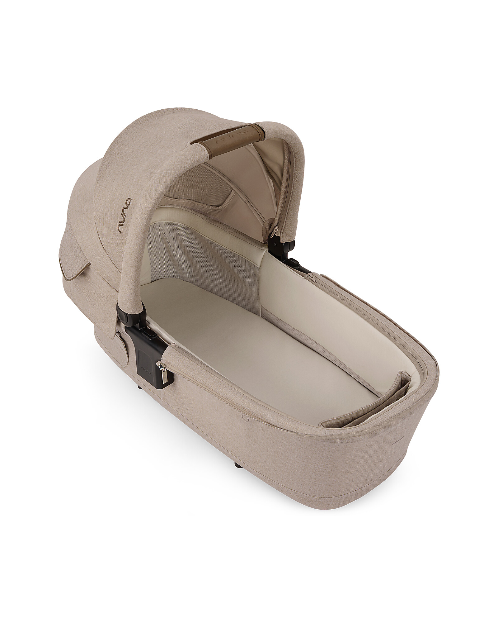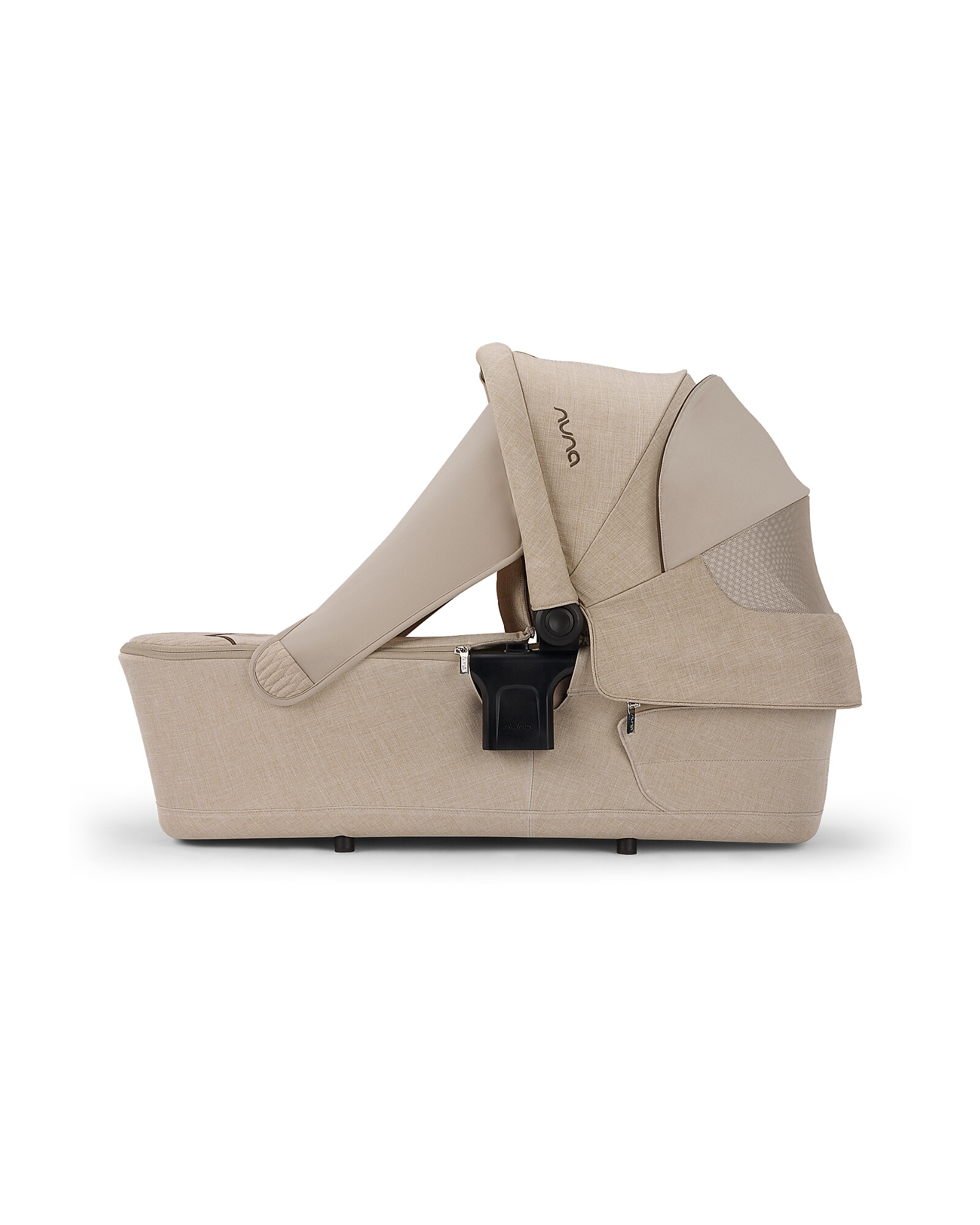 The UPF 50+ canopy, Nuna's iconic Dream drape™, and the included rain cover provide added protection from the elements and lovely, uninterrupted naps. Integrated memory release buttons and a hand-sewn leatherette carry handle make for a simple detachment from the pushchair frame–because new parents deserve snuggles not struggles.