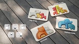 The three animals of this cute and colourful puzzle perfectly fit their spaces on their base. It's a lovely dog's family composed by three dogs of different color and shape! This simple yet extremely educational toy is suitable for babies of 12 months and older and is designed to develop manual and coordination skills and to learn colours and shapes. Moreover, kids can create a story from the figures to encourage imagination!