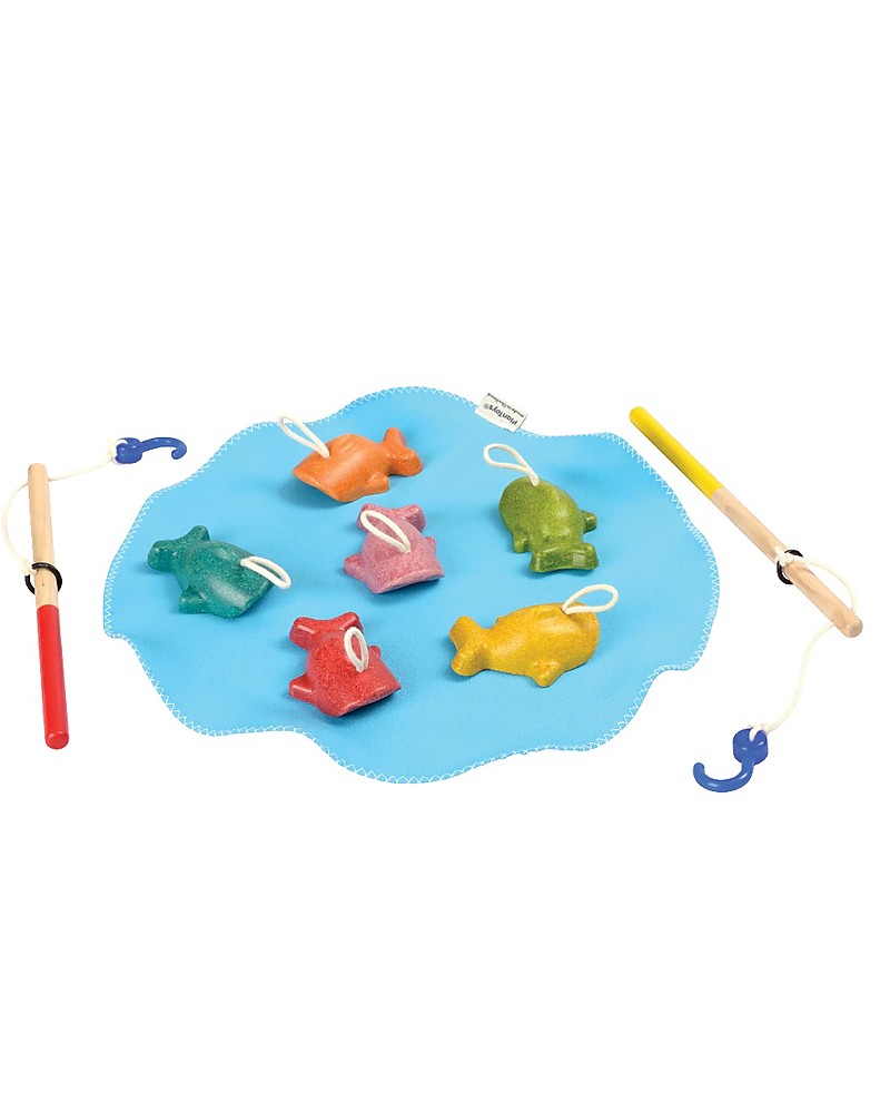 Gone fishin’! This Wooden Fishing Game by 100% green brand PlanToys set includes 6 colorful fish, pond-blue fabric, and 2 fishing rods. Rods can be adjusted from beginner to advanced level.