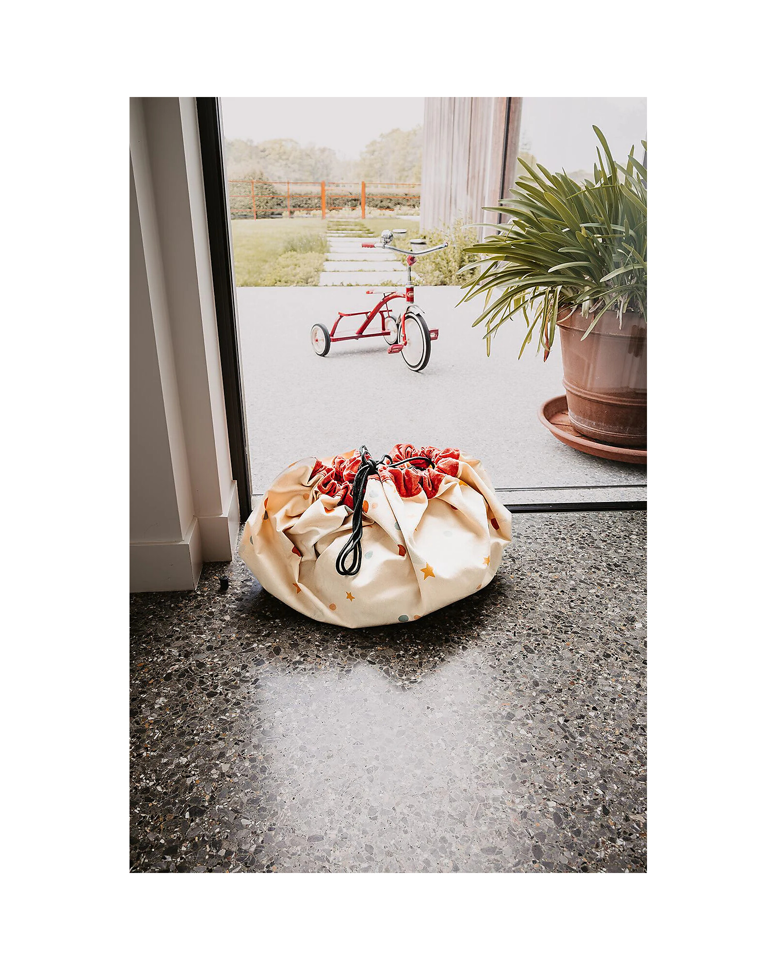 Its spacious design allows you to easily carry toys, balls, and much more. When it’s time to tidy up, simply pull the drawstring and everything is stored in an instant. The adjustable shoulder strap ensures maximum comfort during transport, while the sand and dirt drainage hole keeps the bag clean and lightweight, ready for new adventures.