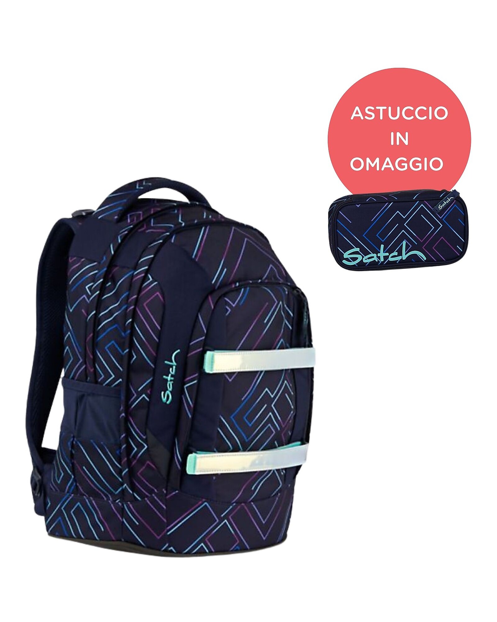 As a free gift, the rigid Satch pencil case, with colorful elastic loops for pens and pencils and a divider compartment with organizer, makes organizing school supplies easy and fun.