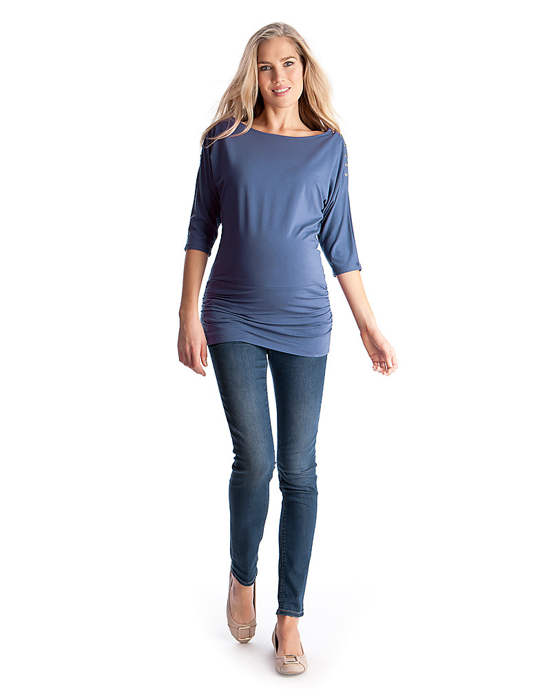 Light up your pregnancy in any season with this gorgeous maternity and nursing top from the Séraphine brand. Made in a fabulous new shade of steel blue, in a soft and silky viscose jersey stretch, it features pretty little gathers at the lower part of the side seams, wide batwing sleeves, and a boat neckline. Wear this top for the full 9 months and feel how comfortably it adapts to your changing shape, never feeling tight. Then when baby arrives wear it for super easy breastfeeding – just open the pearlescent poppers at the shoulders. Flattering and chic, this is the top that goes with any outfit, and can be worn for any occasion.