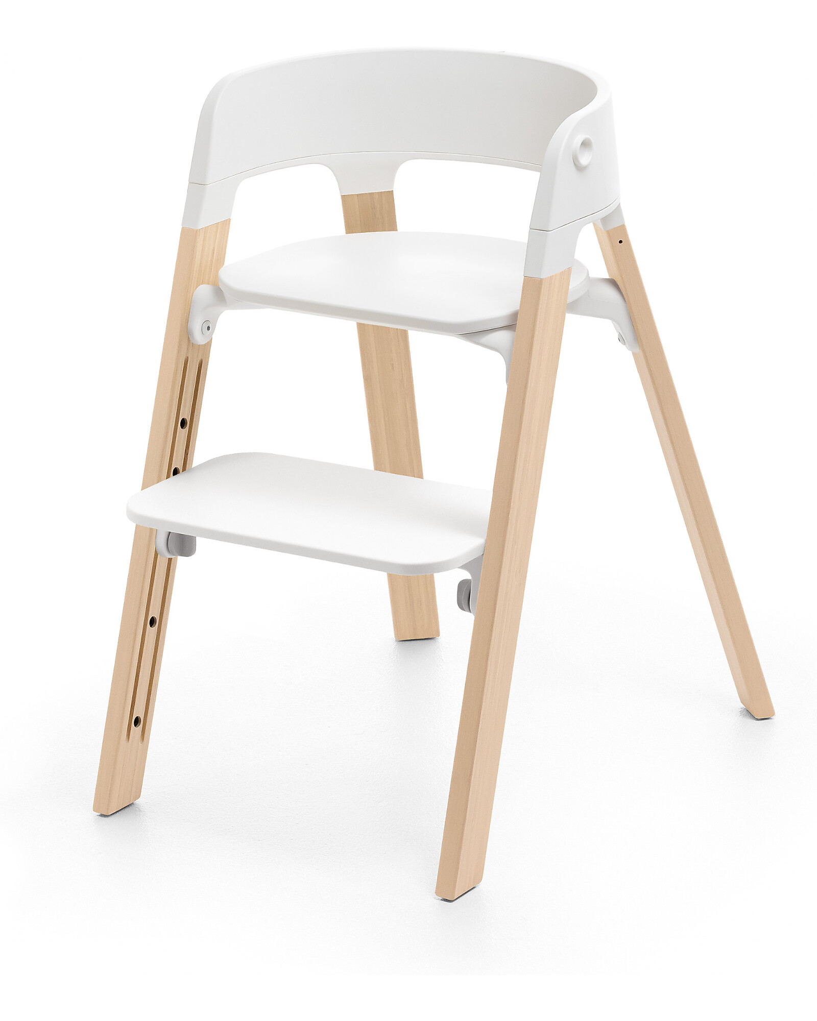 The Stokke® Steps high chair is the ideal choice for those looking for a practical, safe and timelessly designed adjustable high chair. Suitable from 6 months up to around 10 years, it grows with your child, adapting to every stage thanks to the adjustable backrest and footrest and the dual seat height. Adjustments are quick and tool-free, ensuring maximum everyday convenience. Made with premium materials, such as sturdy bamboo legs, it combines stability with Scandinavian style. The safety system with a 5-point harness, along with the easy-to-clean tray and straps, makes Stokke® Steps perfect for daily use. An all-in-one high chair designed to support your child’s growth and make parents’ lives easier.