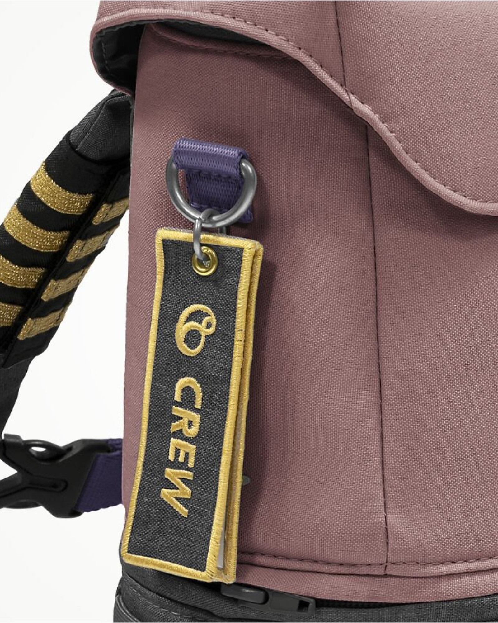 Removable striped straps for a modern aviator look - All components included: backpack, name tag and padded seat mat