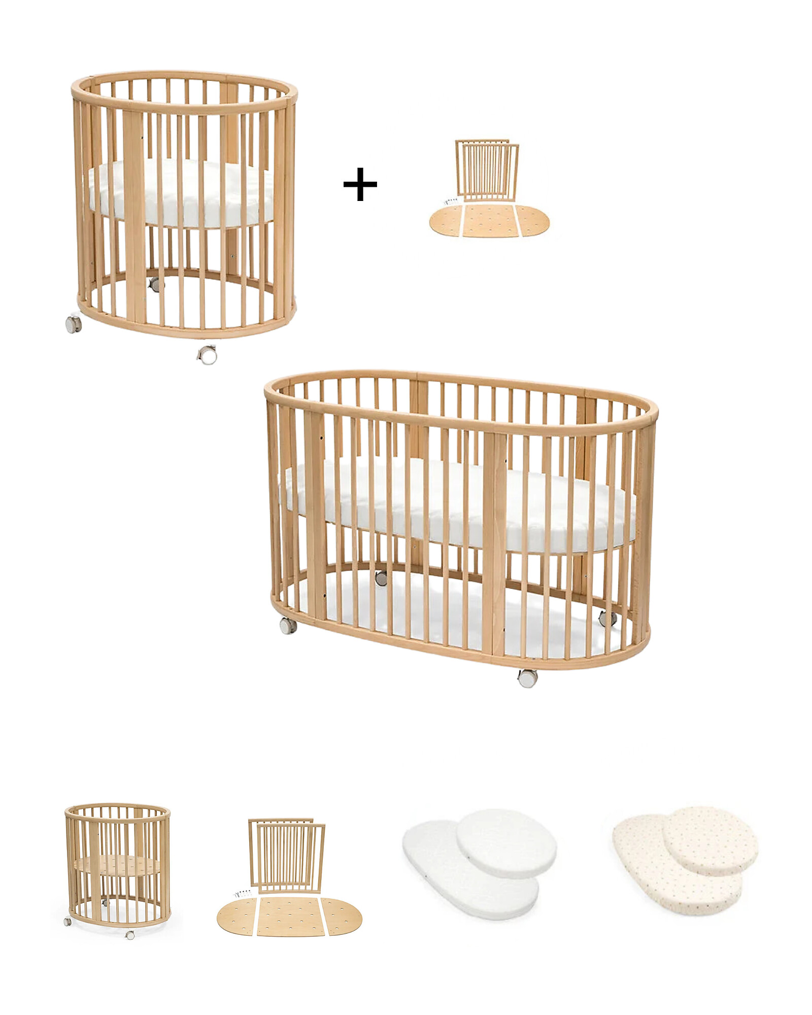 Transform your newborn's sleep into a comfortable and safe experience with the Sleepi™ Mini Set, consisting of a crib, mattress, and matching fitted sheet. The Sleepi™ Mini crib, with its iconic oval shape, envelops your baby in a warm and reassuring nest-like environment. Crafted from FSC® beech wood, it features rounded edges, a ventilated base, and four adjustment levels to accommodate growth. The swivel wheels with brakes allow for easy movement and gently rocking your little one, ensuring convenience and peace of mind.