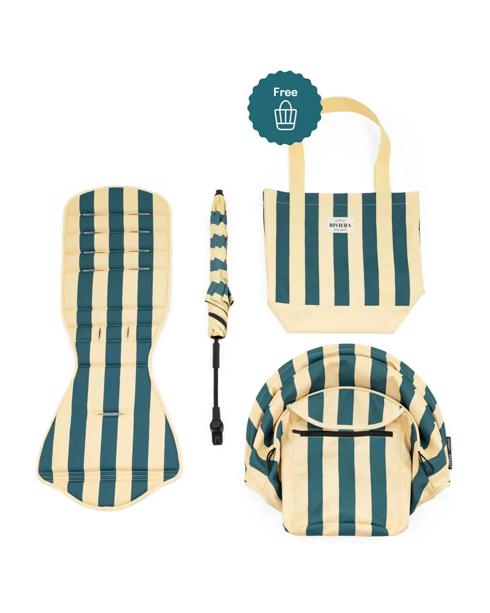 - Includes: Stroller cover set, sunshade umbrella, and Riviera bag