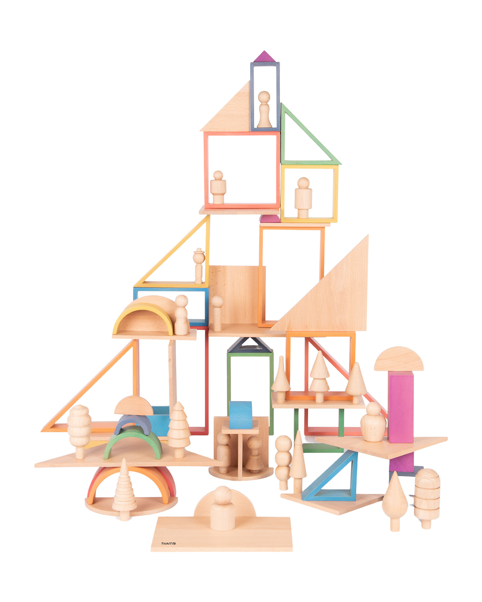 Does your child love building and constructing towers and fascinating structures? Then they will adore the tickit® Rainbow Architect Set, made up of four geometric shapes (squares, rectangles, triangles, arches) nested together with the inner block in each nesting group forming a solid 3D shape. Made from beautiful smooth beech wood with a natural wood grain finish in seven different colors, these shape sets will allow your child to unleash their creativity and innovation.