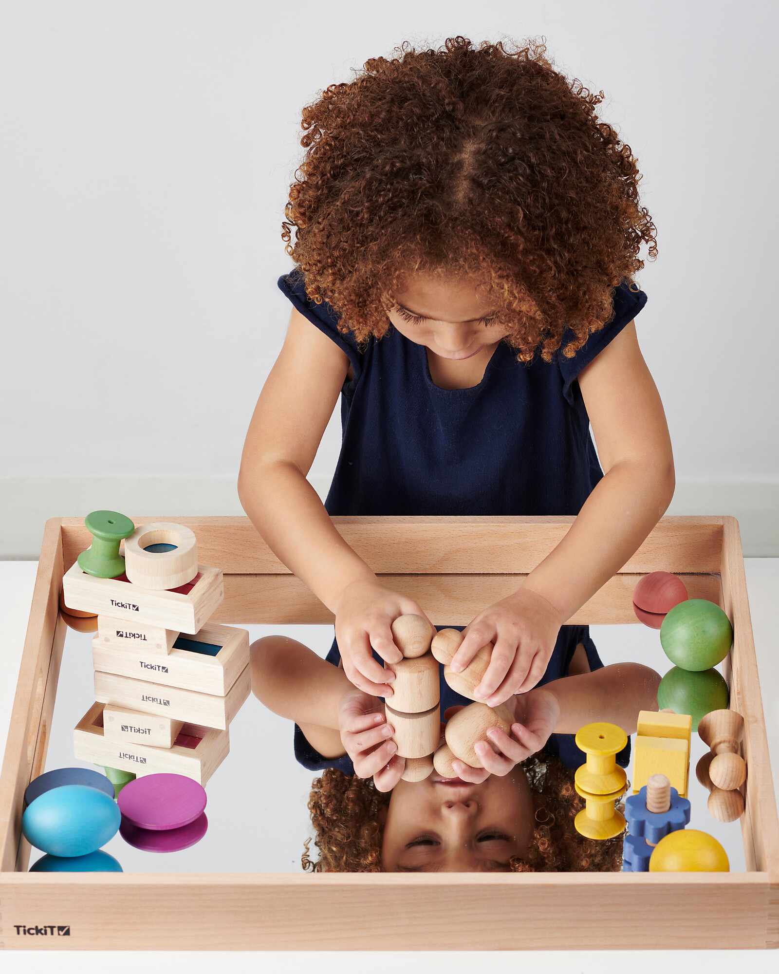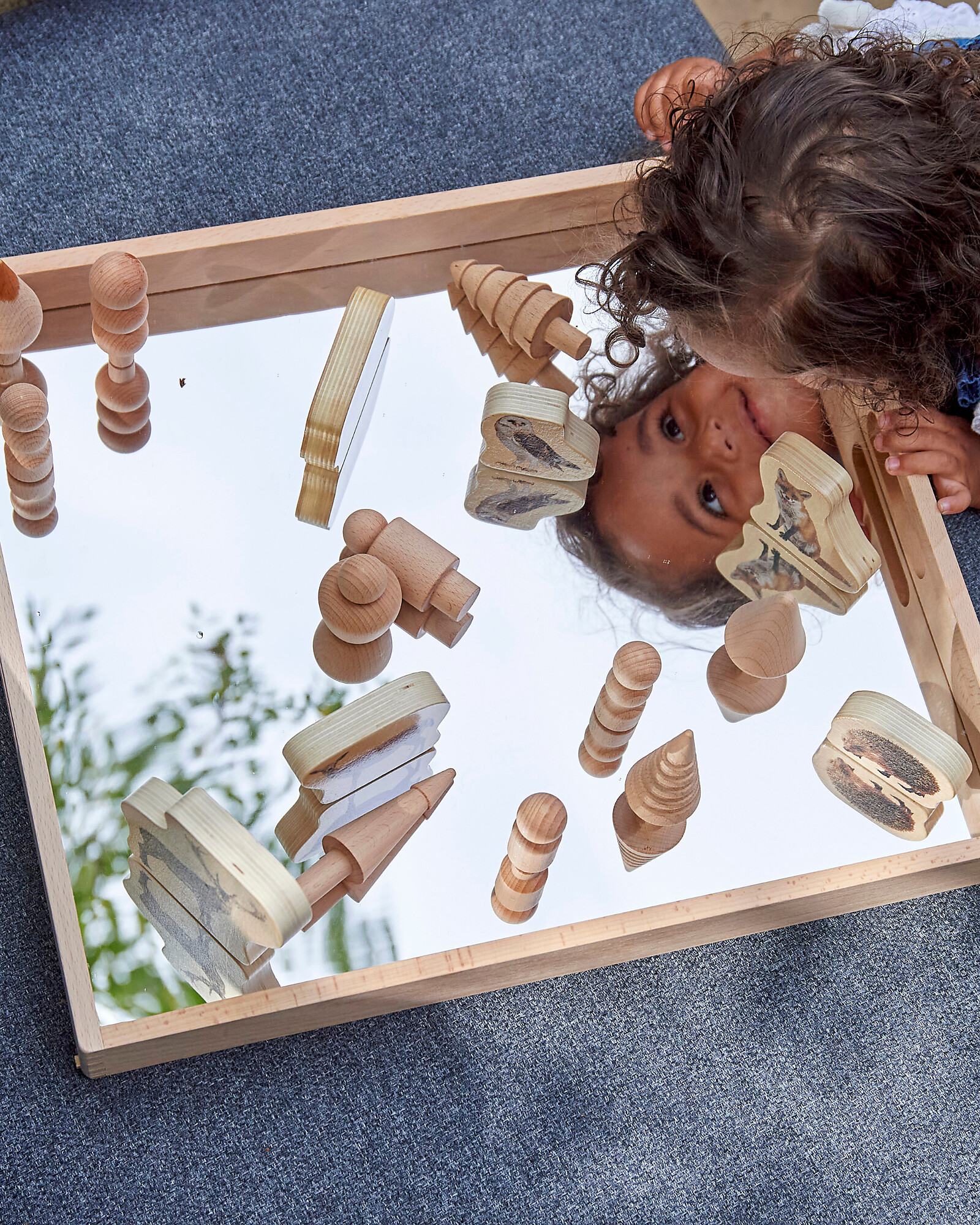 The small wooden mirror tray from the English brand TickIT is a fun and interesting game for children that will allow them to explore their treasures and become fascinated by exploiting the reflective properties of the mirror: use the tray to examine the objects and between light and reflections the fun will become unlimited! The mirror can also be used on its own to explore your own reflection and experiment with facial expressions given by emotions or language. A useful resource made of natural FSC beech wood . A brand that talks about fun and learning, recognized and respected by schools, educators and appreciated in award guides and magazines dedicated to childhood.
