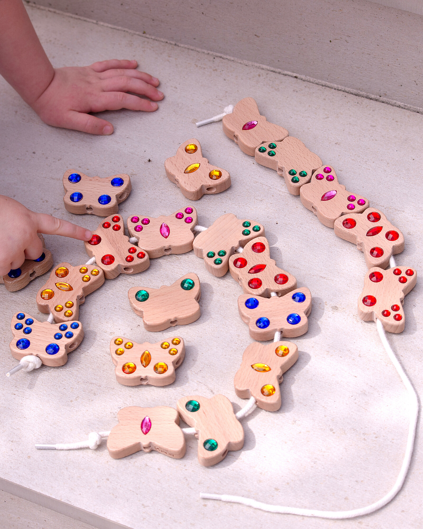 Start learning with these delightful wooden butterfly-shaped beads. Made from FSC-certified beech, smooth and sturdy, each butterfly features a unique number of faceted, shiny gems, from one to ten, creating a fascinating visual progression.