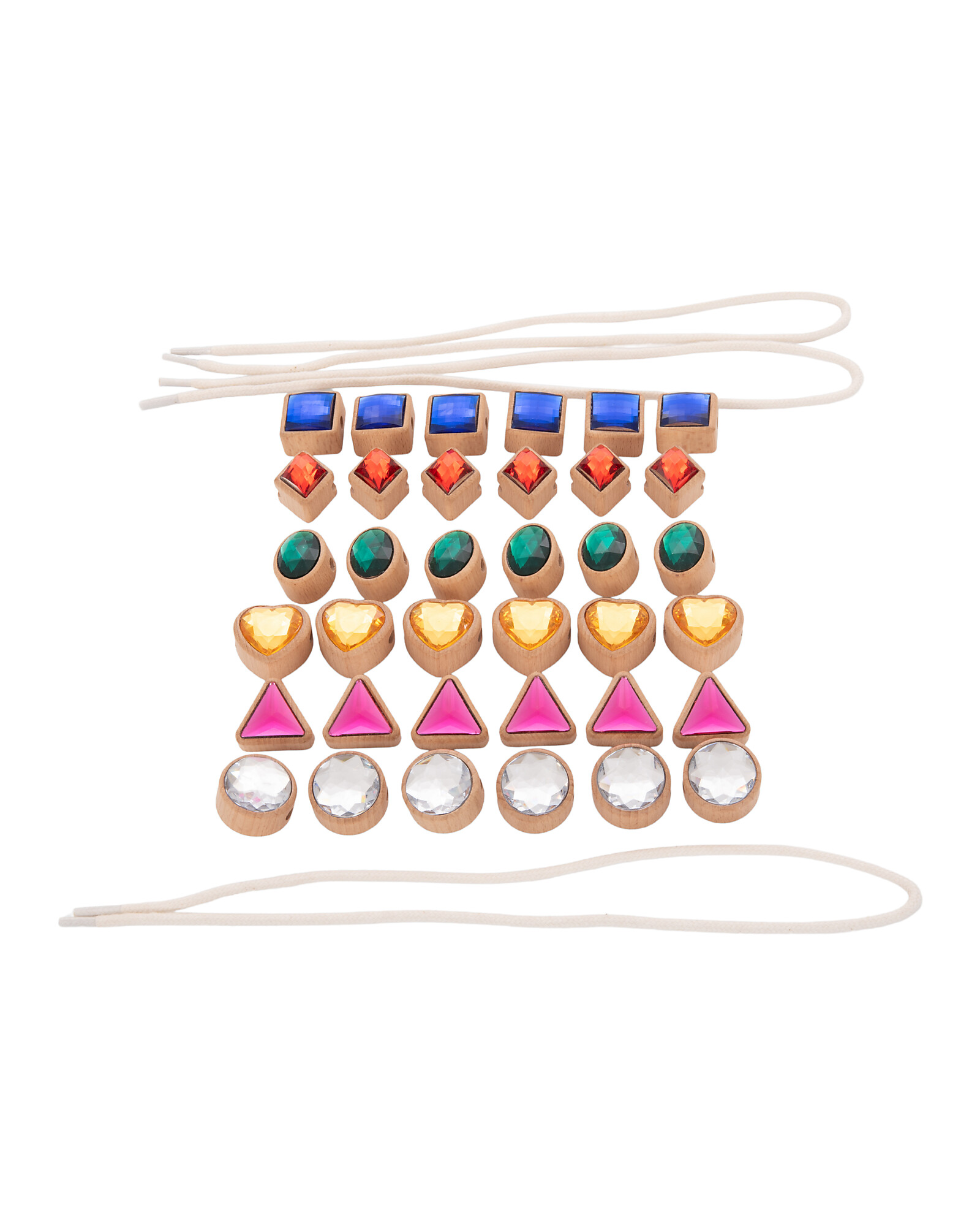 With 36 beads in 6 vibrant colors and geometric shapes, plus 3 sturdy laces, the possibilities are wonderfully endless. String them to create sparkling bracelets, sort by color and shape, make dazzling patterns, or stack them into towering creations.