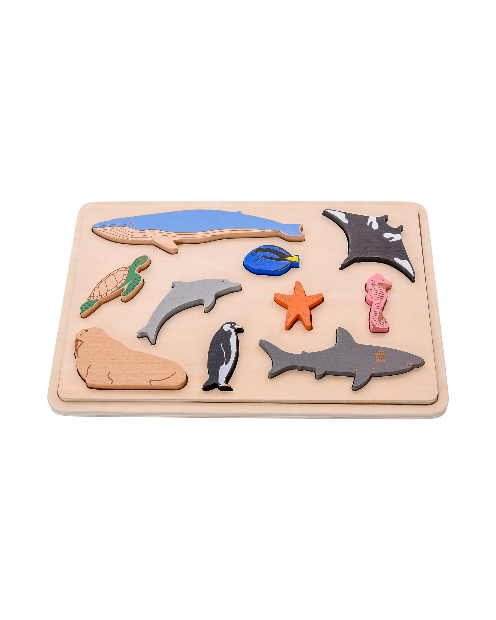 The included animals represent a rich and fascinating ocean world, featuring a mix of painted, natural, and printed finishes: penguin, shark, starfish, dolphin, turtle, whale, seal, fish, and ray. Each piece invites discovery and storytelling.