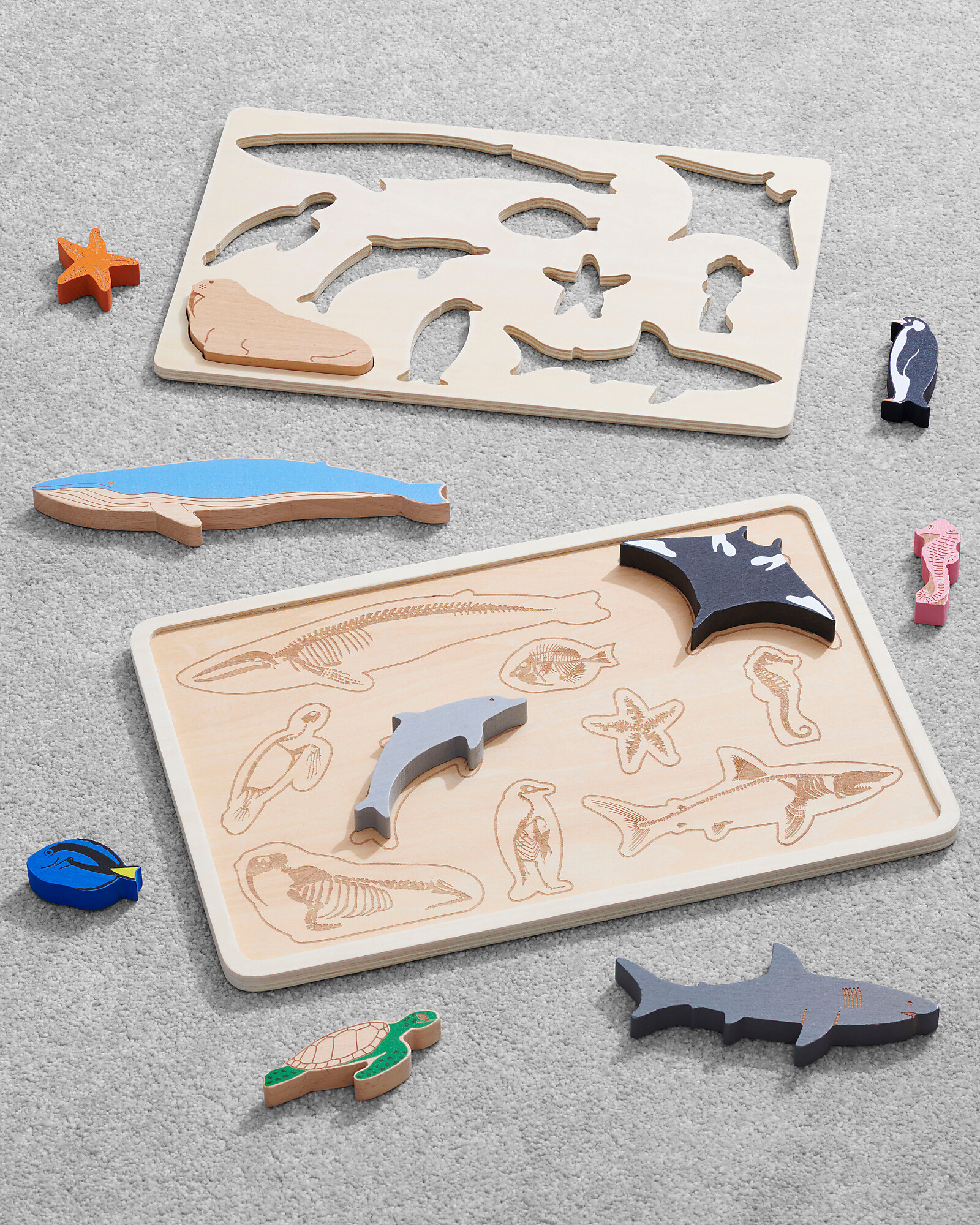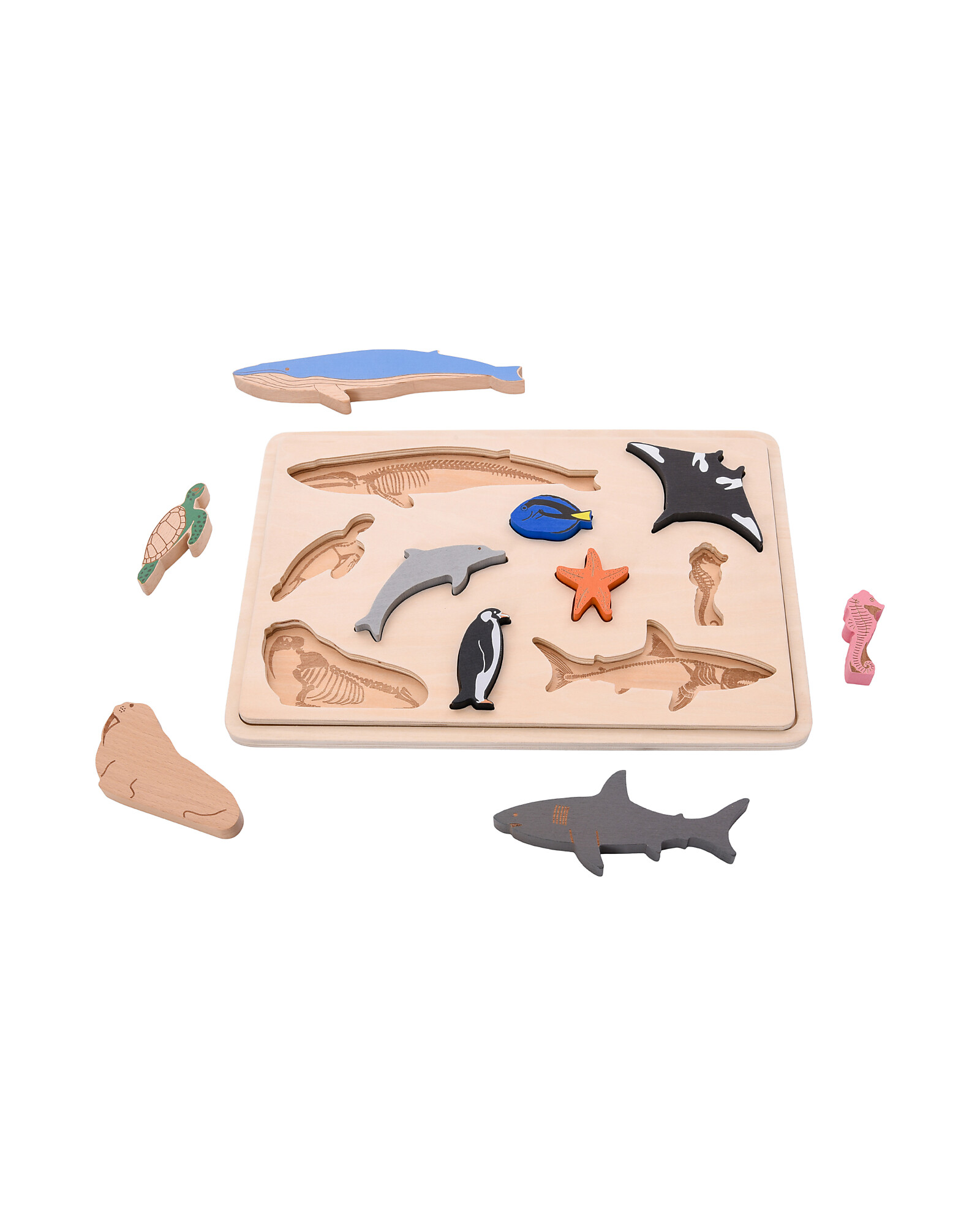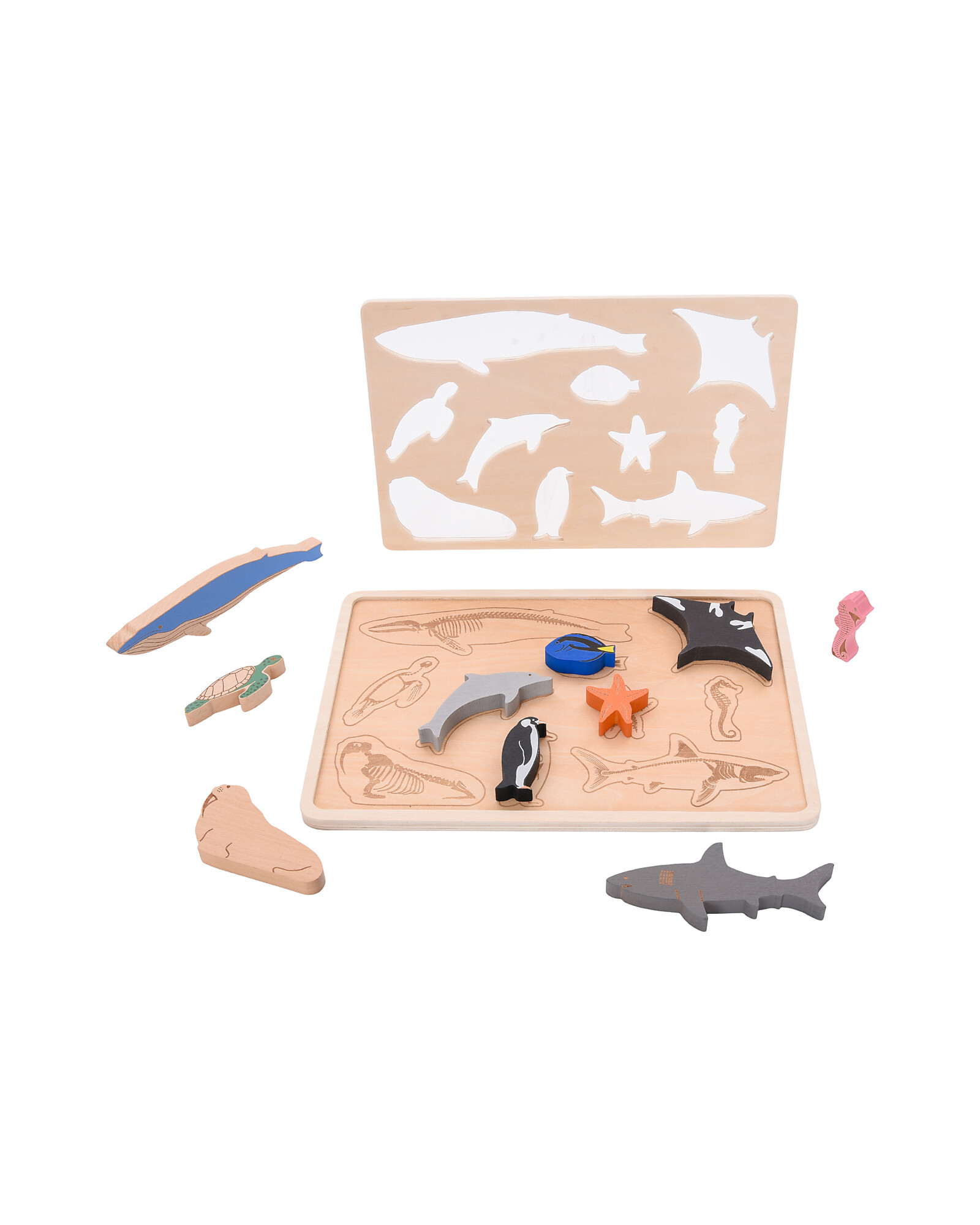 The wooden tray features laser-engraved animal skeletons to match with the corresponding figures, offering an educational activity that supports recognition and logical thinking. An additional layer of removable shapes adds an extra puzzle element, making the experience even more complete.