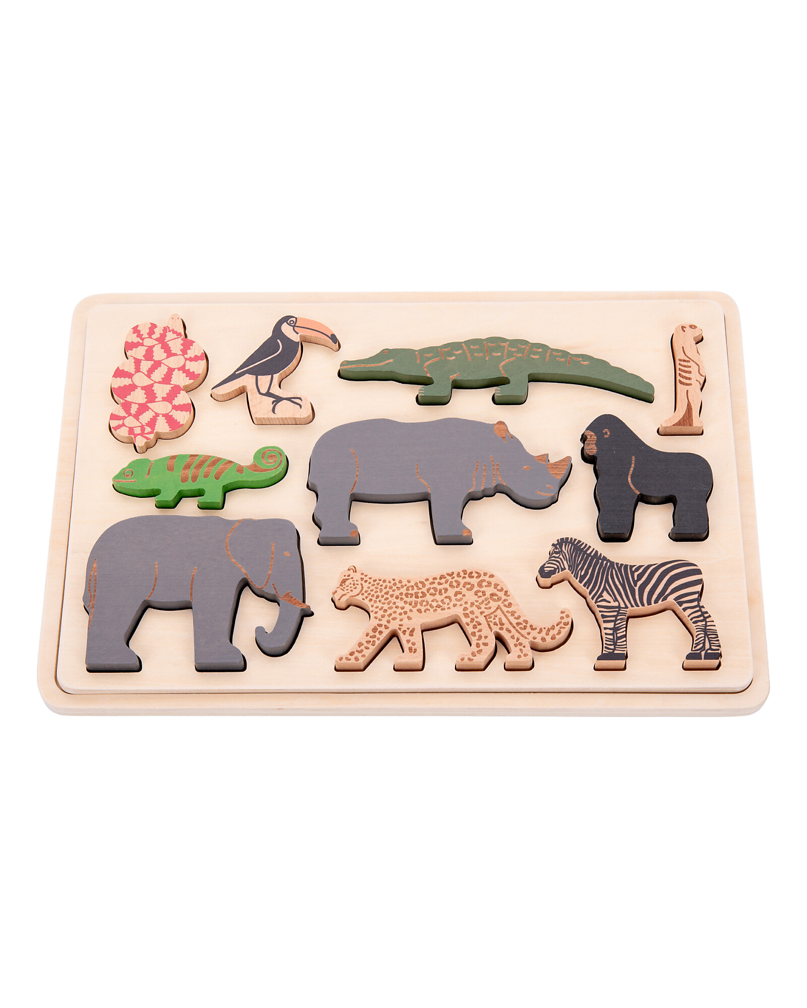 Crocodile, chameleon, gorilla, elephant, and rhinoceros are painted with laser details. Leopard and meerkat are natural with laser details. Toucan, zebra, and snake are printed in color.