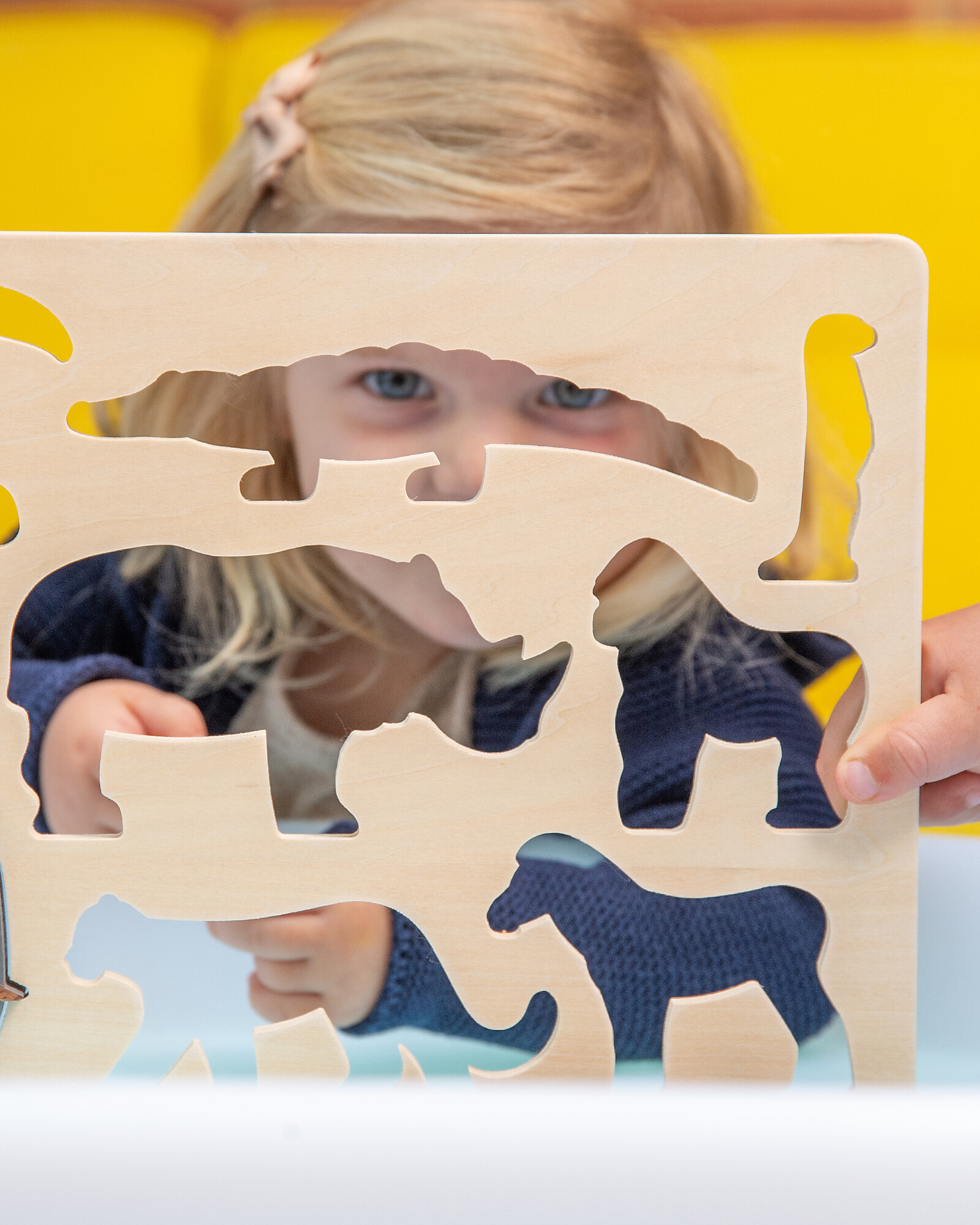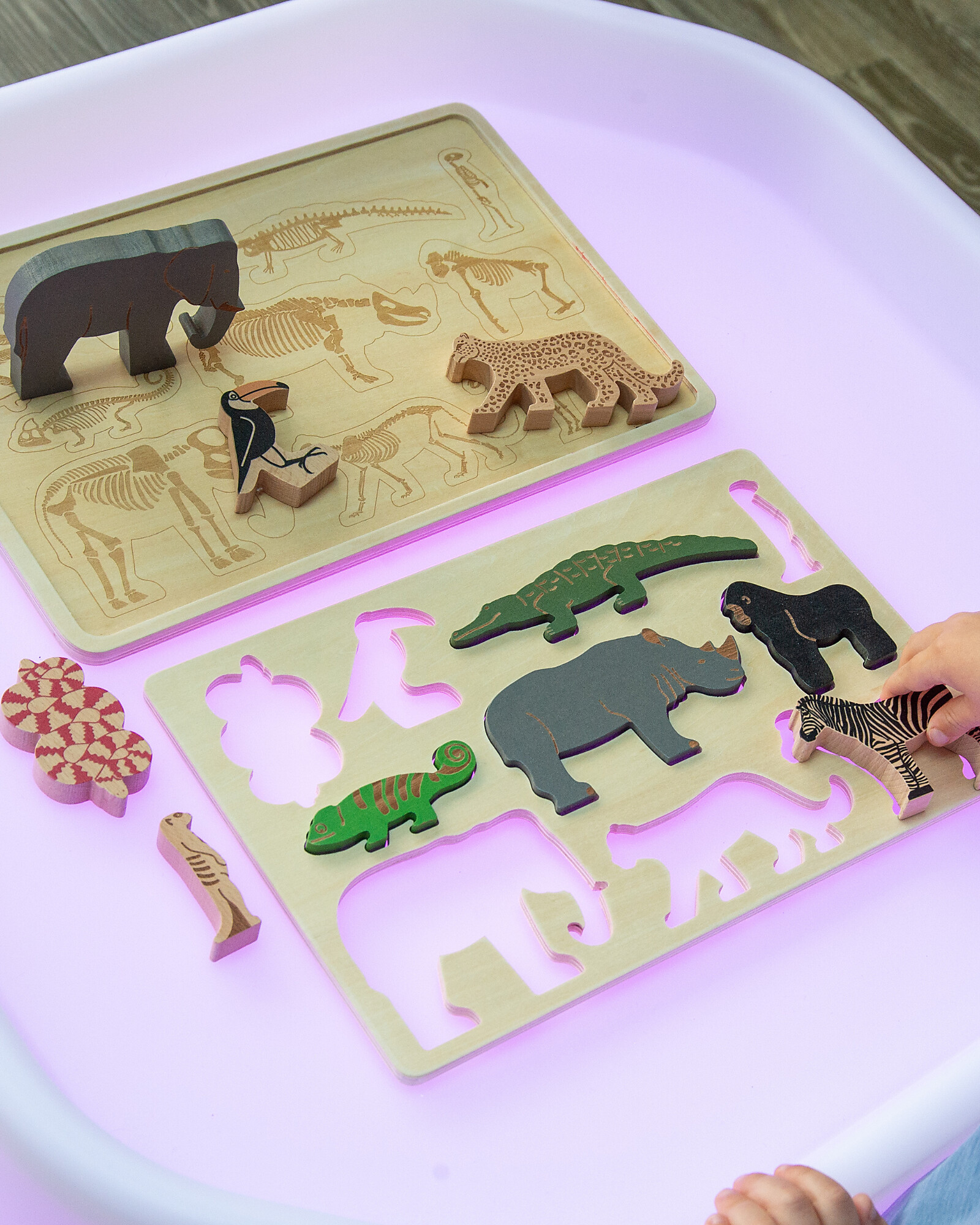The animal pieces are 15 mm thick and double-sided, so they can be placed vertically in imaginative play scenes or stacked vertically to develop coordination and balance skills. The base tray features laser-engraved skeletons to match with each animal, and the removable layer has the animal shapes cut out to create an additional matching activity. The skeletons in the base tray and the features of the animals are deeply laser-engraved for a tactile experience and can be used for tracing or rubbing with crayons on paper; the animal pieces and shape tray can be used for drawing, coloring, or filling with colored rice or beads for further sensory exercise.