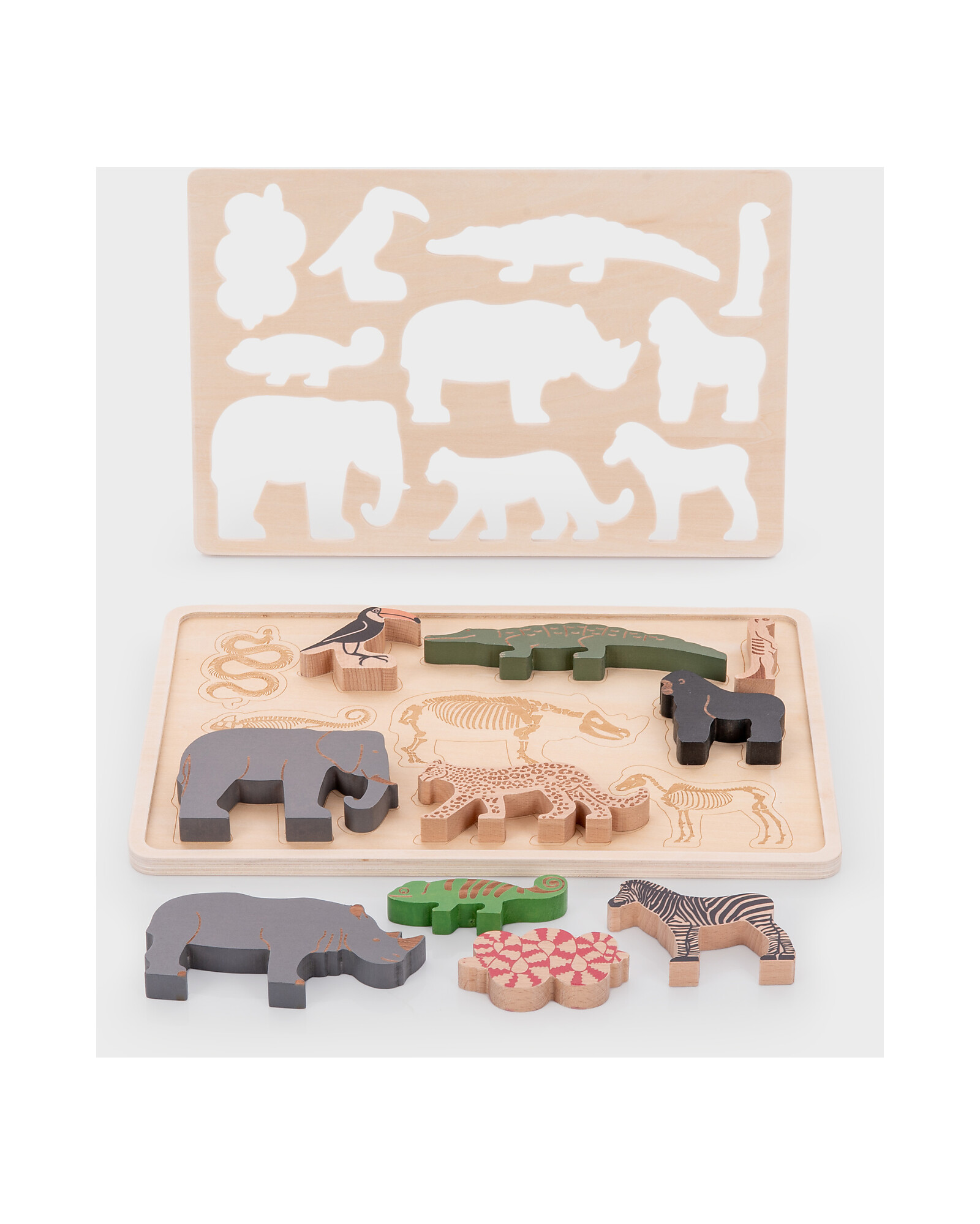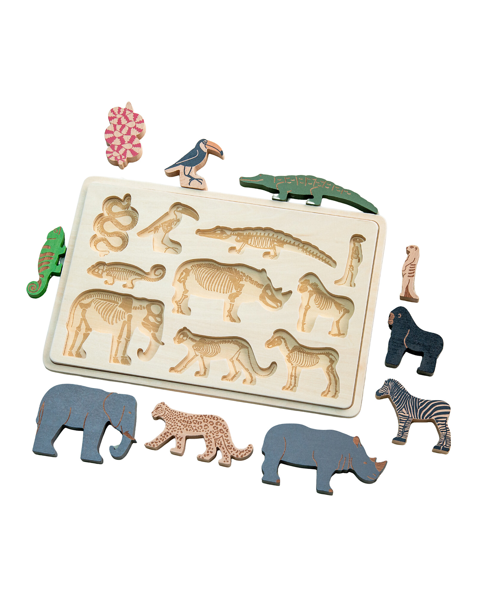 A multistrand wooden puzzle with 10 colorful wild animals, ideal for learning about animals, the differences in skeletons between species, extending the discussion to the human body and its similarities or differences with animals, exploring