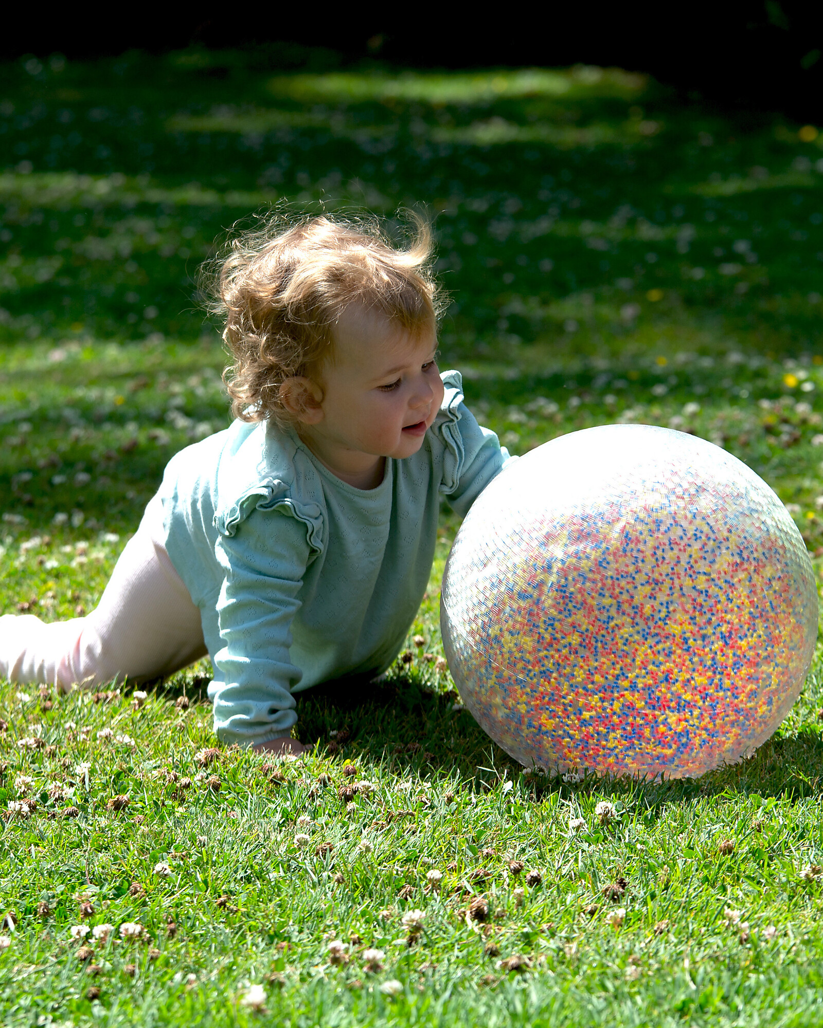 This beautiful and tactile ball contains thousands of tiny colored plastic beads that jingle and dance when the ball is rolled, creating visual and auditory stimuli that will capture your child's interest and imagination.