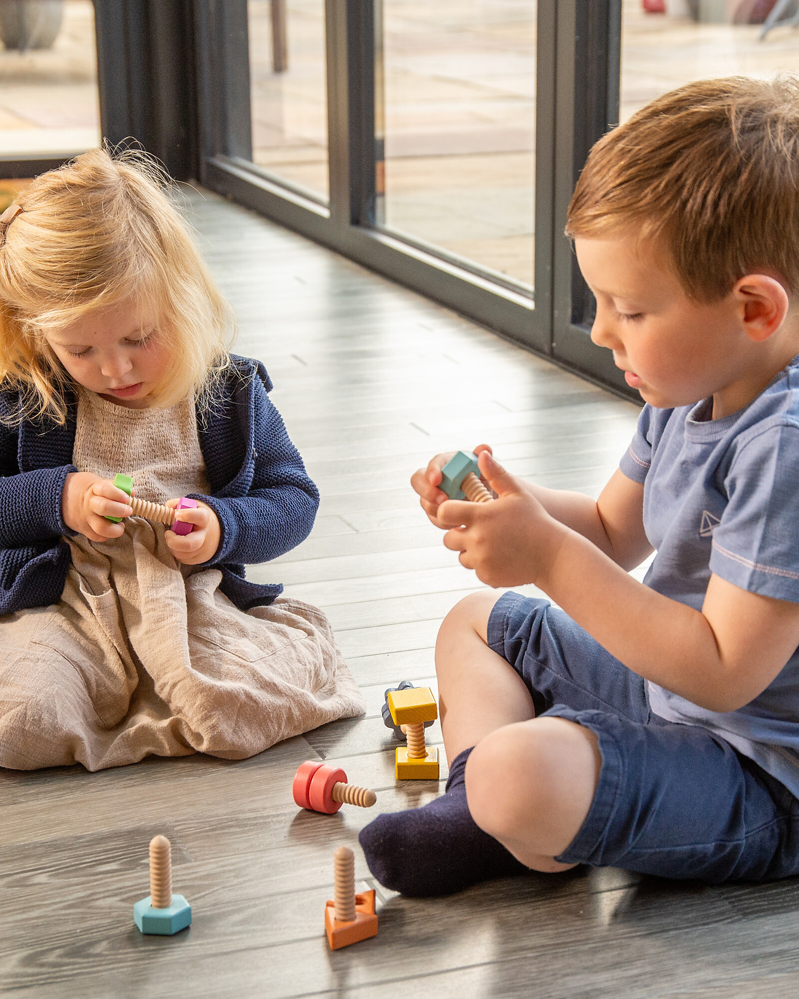 In seven vibrant rainbow colors, Tickit wooden nuts and bolts are made from gorgeous, naturally grained beech wood. Each nut is matched to a bolt in shape and color, with shapes ranging from one to eight sides. These sturdy wooden pieces are ideal for children's hands and offer a fun way to learn colors and shapes by exploring how nuts and bolts fit together. During play, your child will develop their manual dexterity and fine motor skills, as well as practice counting and early math skills.
