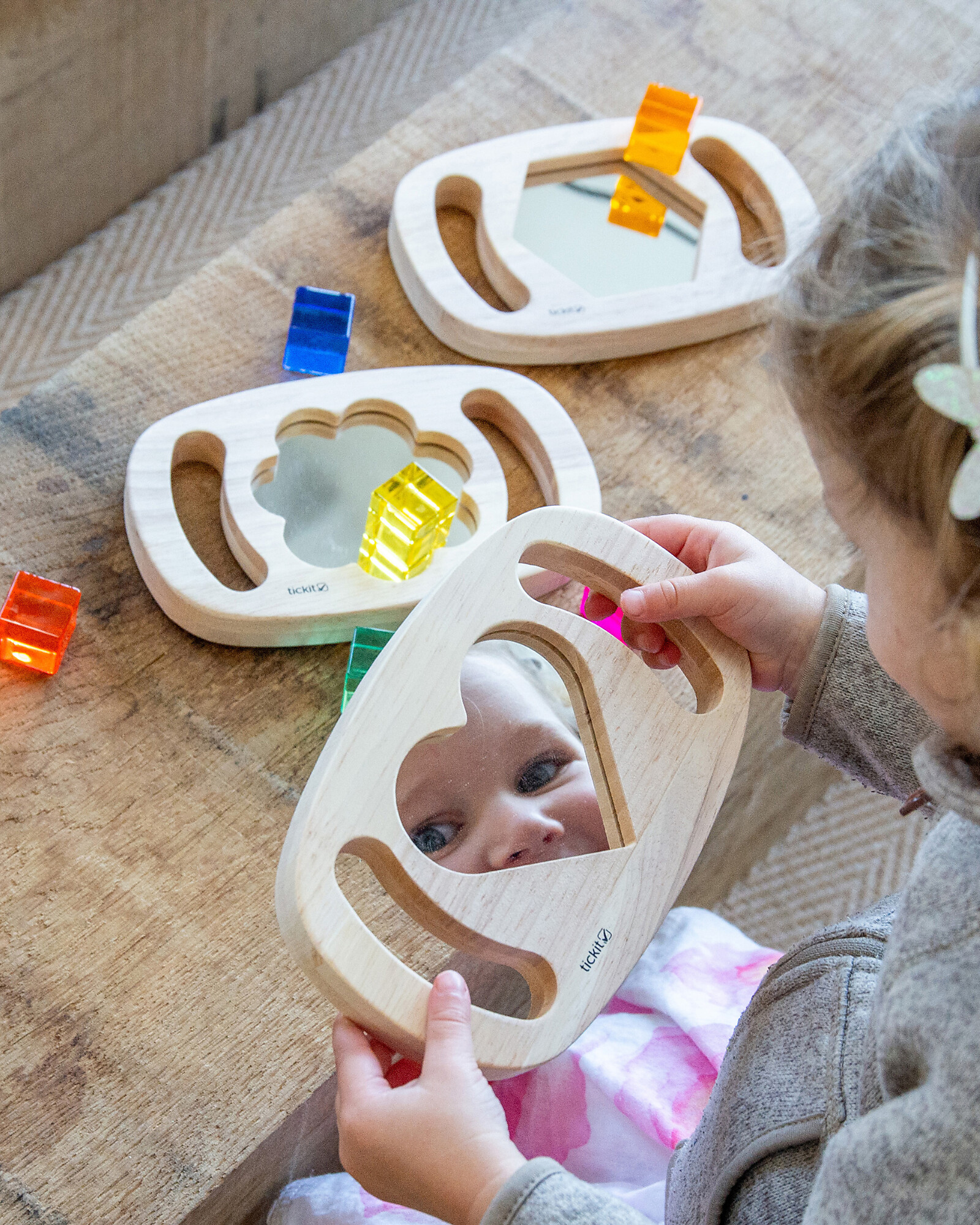 Set of 3 Sensory Toys in FSC Rubber Wood - Mirrors with Shapes - Easy Hold - 12m+