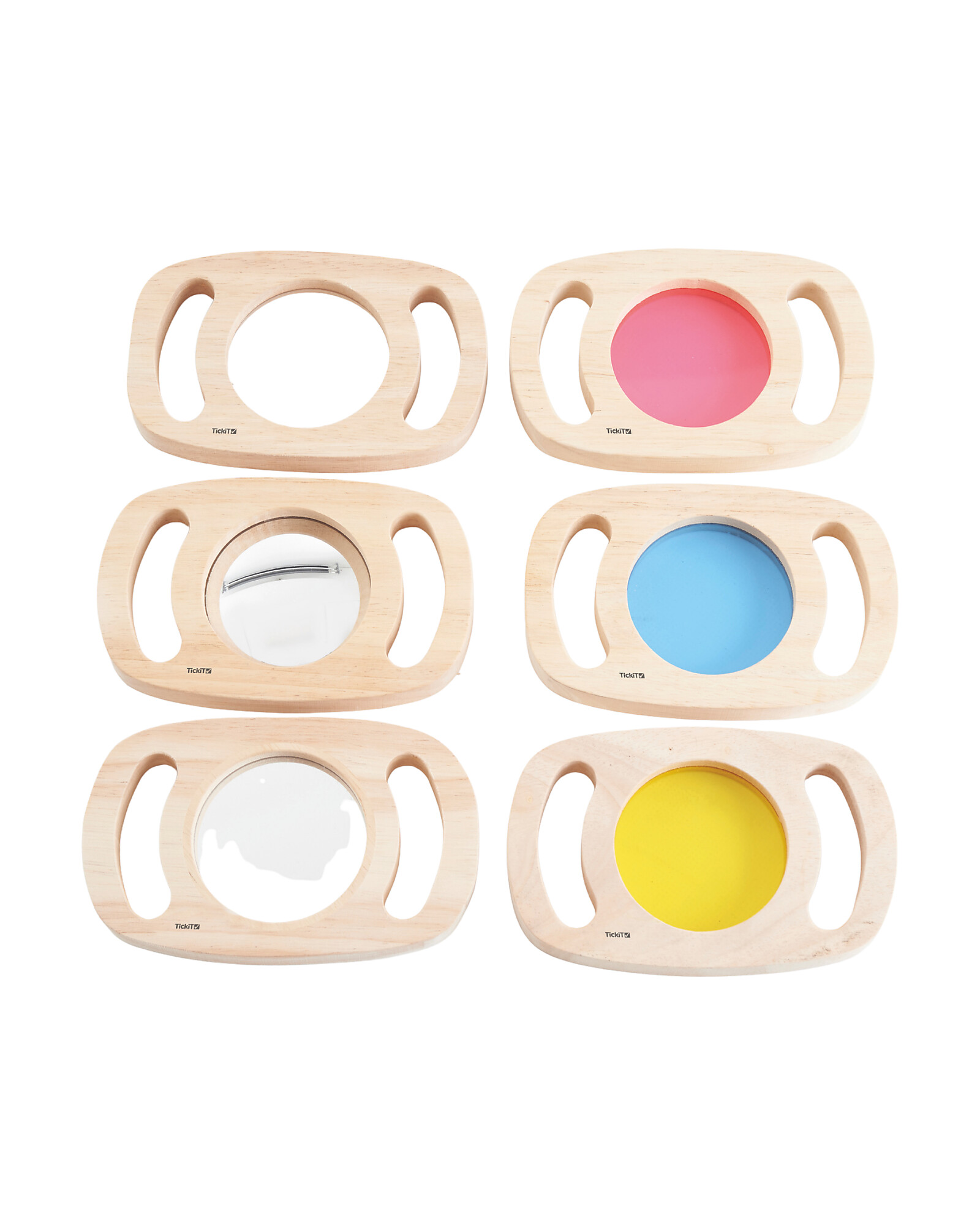 The Easy Hold Discovery Set contains six easy-to-grip frames made of FSC rubber wood, each with handles, and each enclosing a different insert that will help your child interact with the world around them in a unique way. The translucent acrylic panel inserts provide a new colorful perspective of their environment and, when stacked, can be used to mix colors; a giant magnifying lens allows your child to closely observe small objects or insects, while mirrors offer a distorted reflection to stimulate their curiosity. Ideal for use with a light panel.