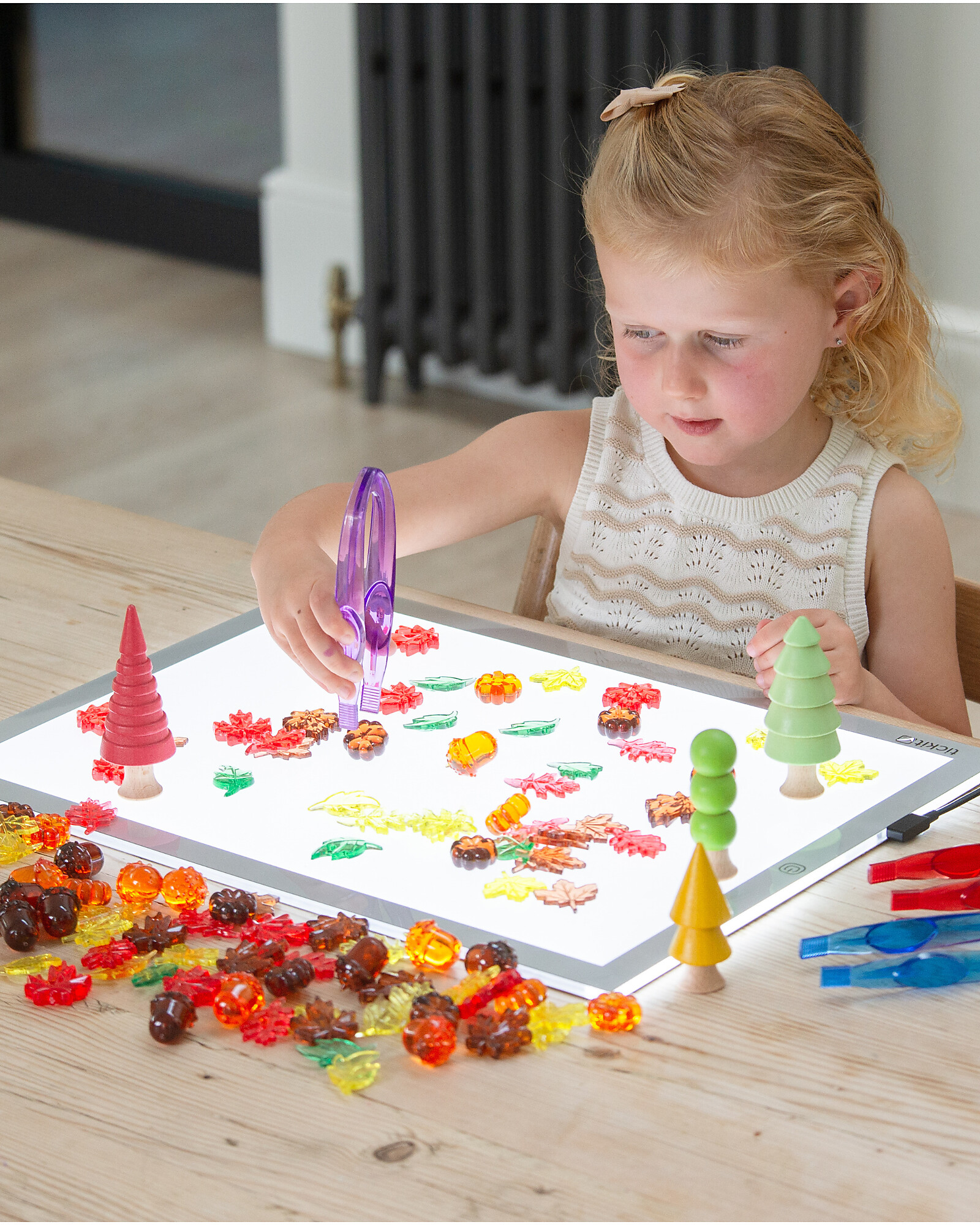 The Tickit set of coloured leaves and seeds is an excellent resource for counting, sorting, creating patterns and carrying out basic maths activities such as addition, subtraction, division and multiplication. The translucent autumn colours make it ideal for use on a light panel, while the detailed shapes add a tactile element to play. The set is compatible with our Translucent Colour Play range, offering creative play opportunities suitable for a wide variety of learning activities. It includes 6 types of leaves and seeds (acorn, pumpkin, thick maple leaf, thin maple leaf, 2-lobed leaf, 3-lobed leaf) in 5 colours (red, orange, yellow, green and brown). All the pieces are stored in a practical lidded jar, for a total of 120 pieces.