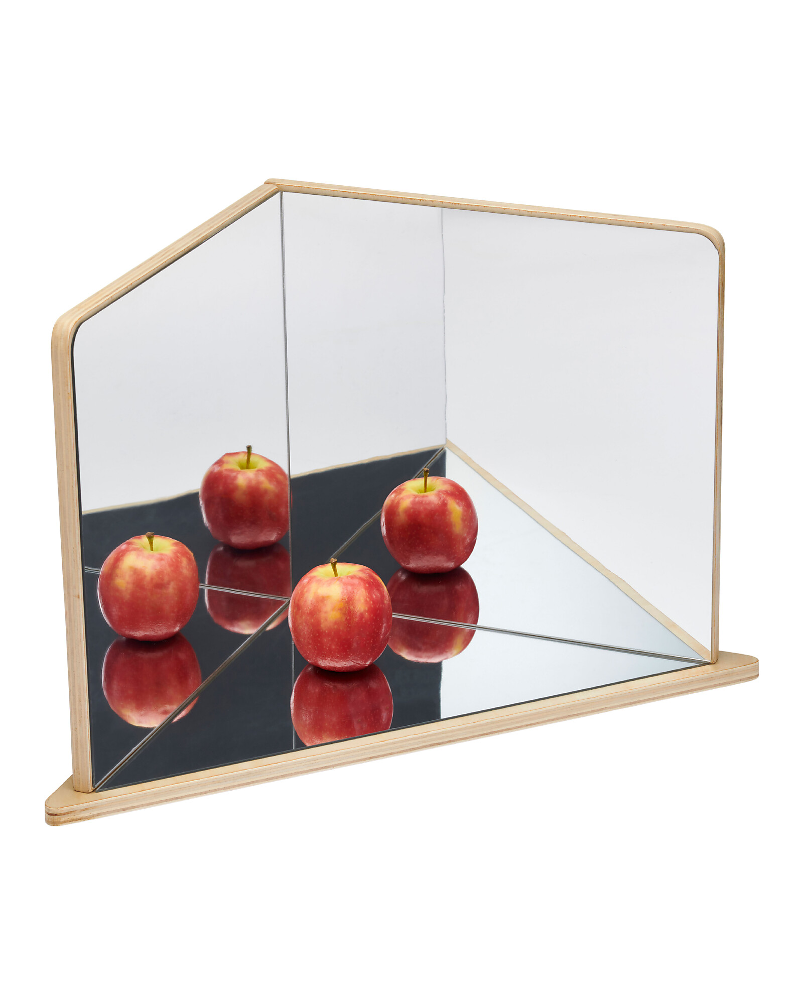 The Tickit Triangular Mirror in Wood is an exciting maze of flat mirrors designed to let your child experience reflection. With a beautiful 90-degree angled design made of birch plywood supporting a background, sides, and base of transparent mirrored acrylic, objects are reflected backward and forward infinitely!