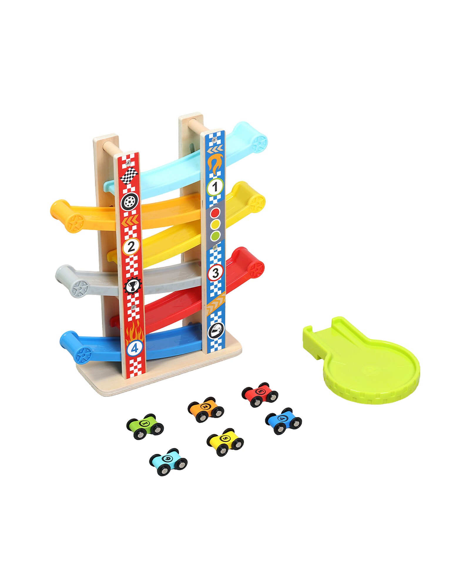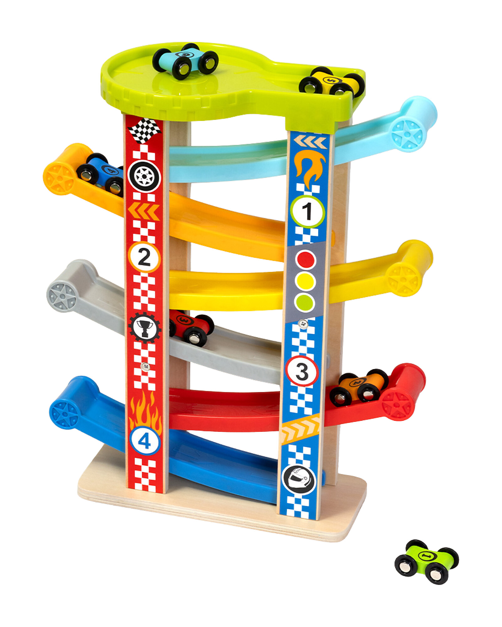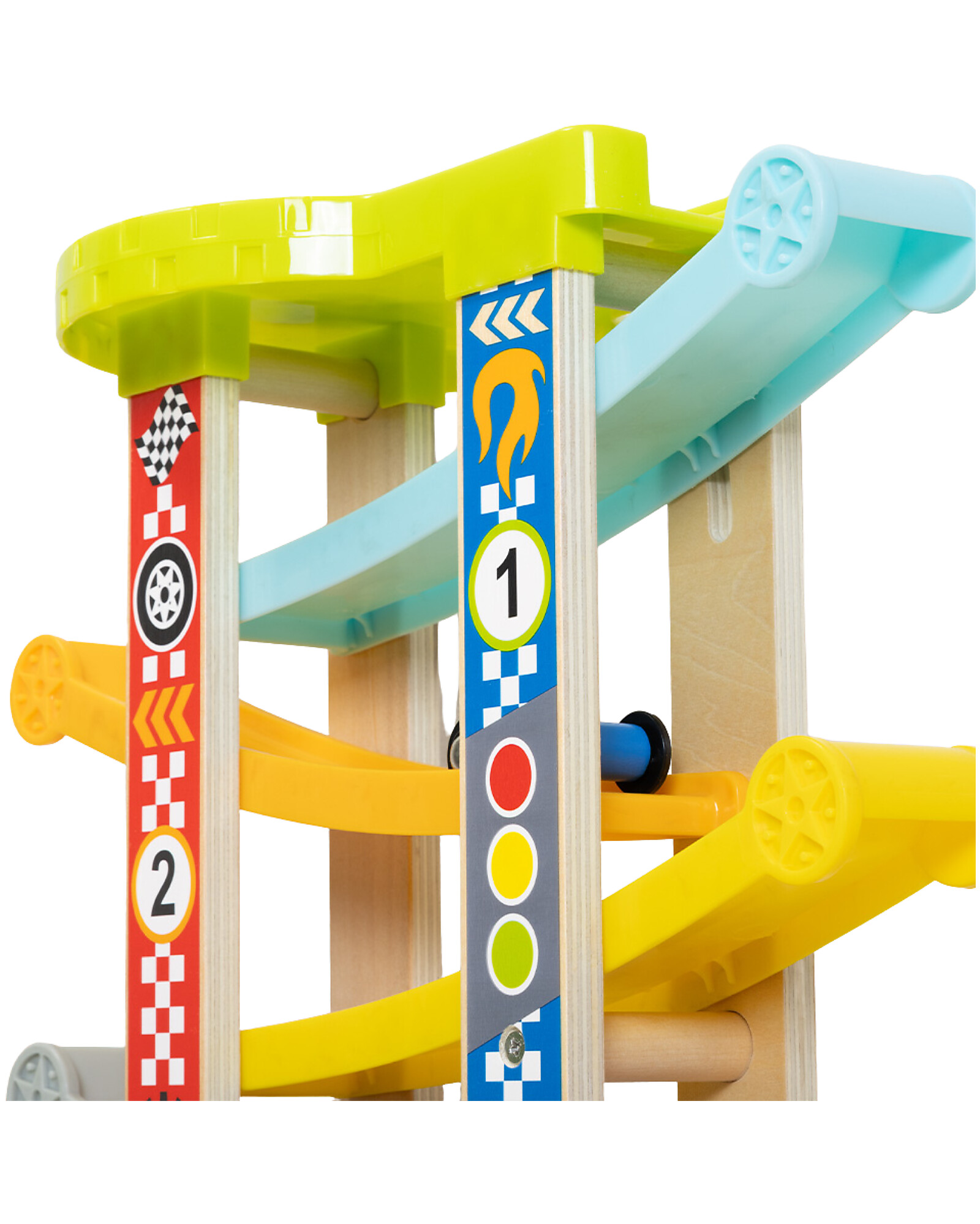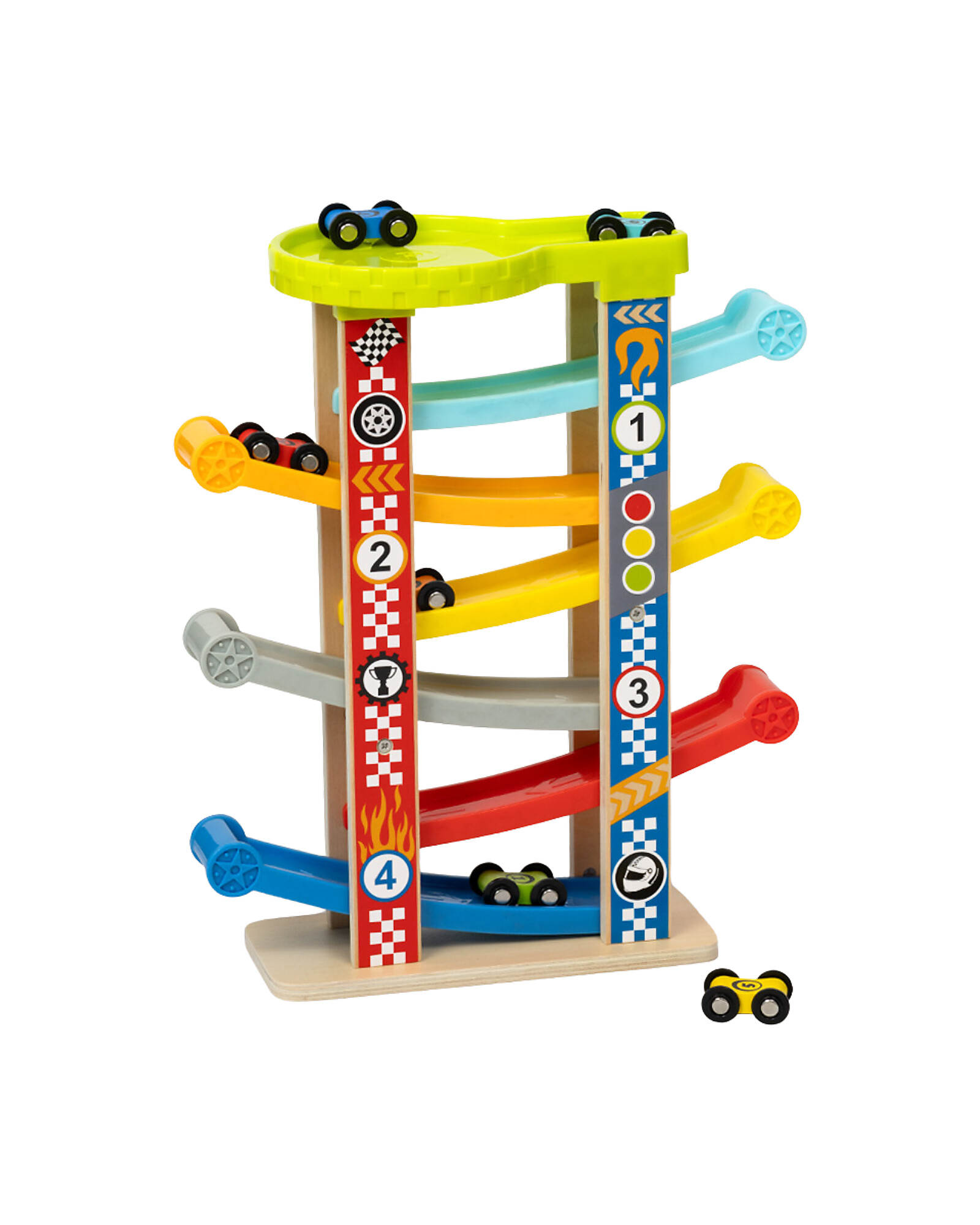 Three, two, one... go! This Wooden Car Tower is the most exciting racing toy: children can launch the 6 included cars from the top of the tower and watch them slide down the spiral racetrack. The plywood and MDF structure is stable and safe. The game develops motor coordination, cause-and-effect understanding and concentration. A timeless classic, perfect for little racing drivers from 18 months!