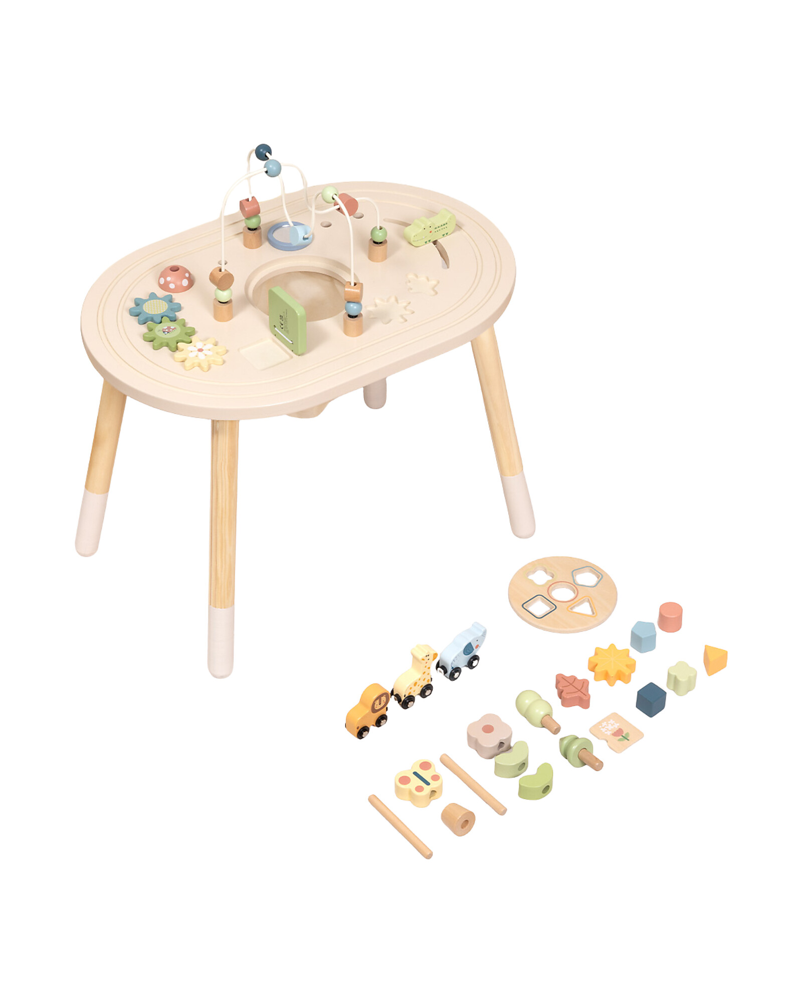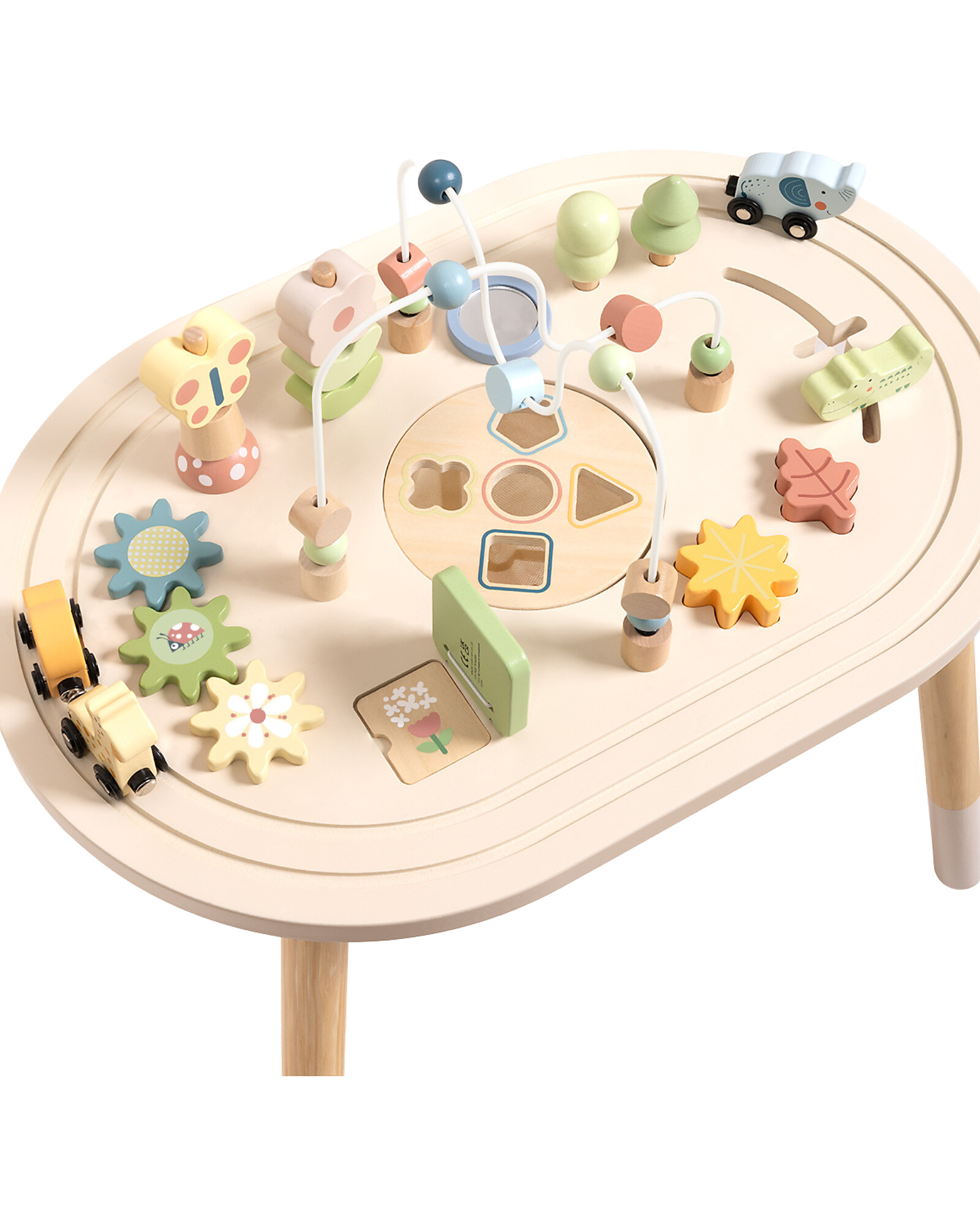 - Design: Oval surface with integrated activities