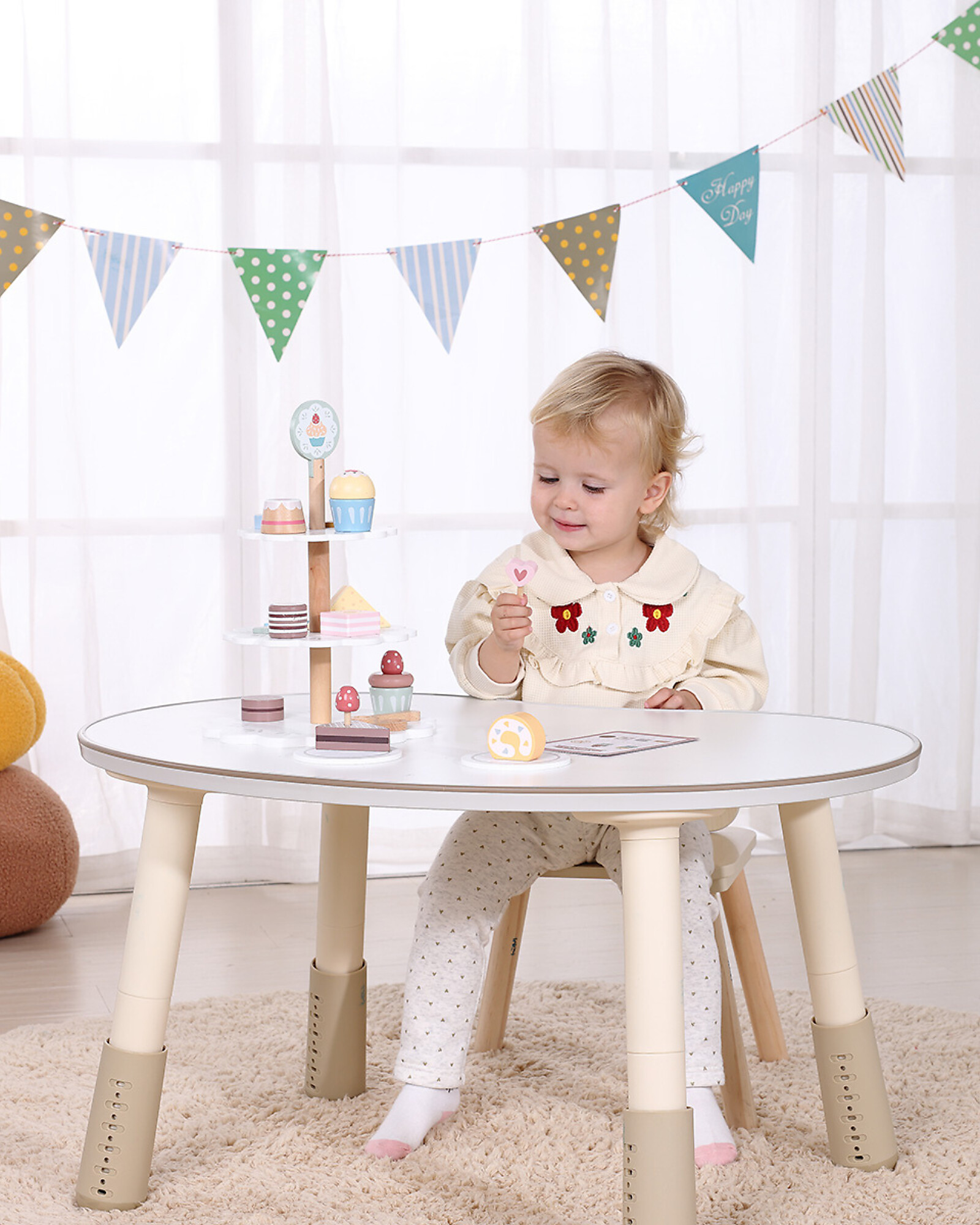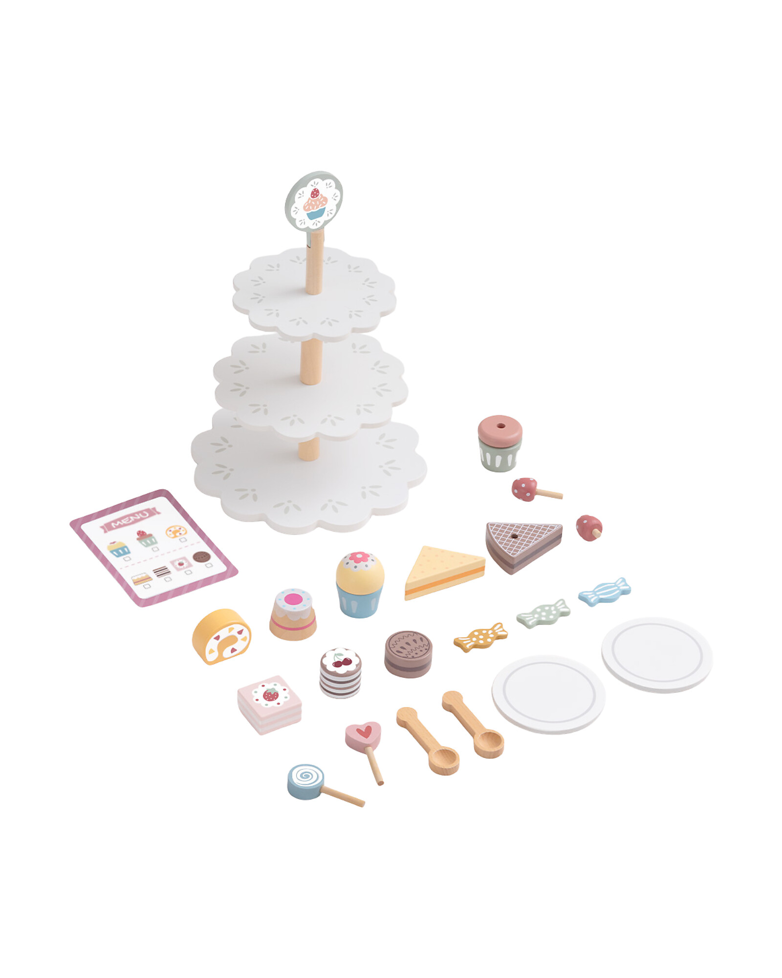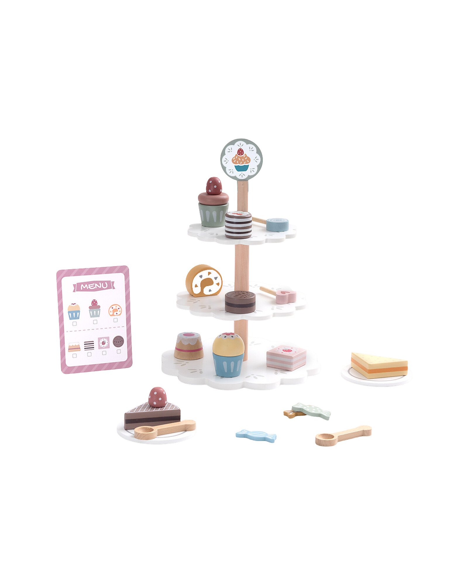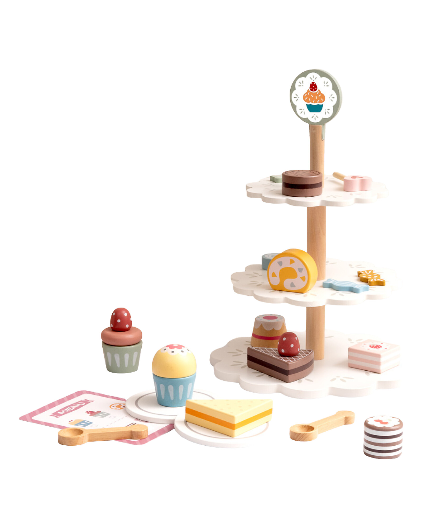 Welcome to the dream patisserie! This Wooden Cake Stand turns play into a pastry art: with 22 elements including cakes, muffins and decorations, little chefs can assemble fantastic sweets and set up a true patisserie display. Juniper wood and MDF ensure sturdiness and vibrant colours. The joyful design stimulates visual creativity and symbolic play. A delightful toy, perfect for future pastry chefs!