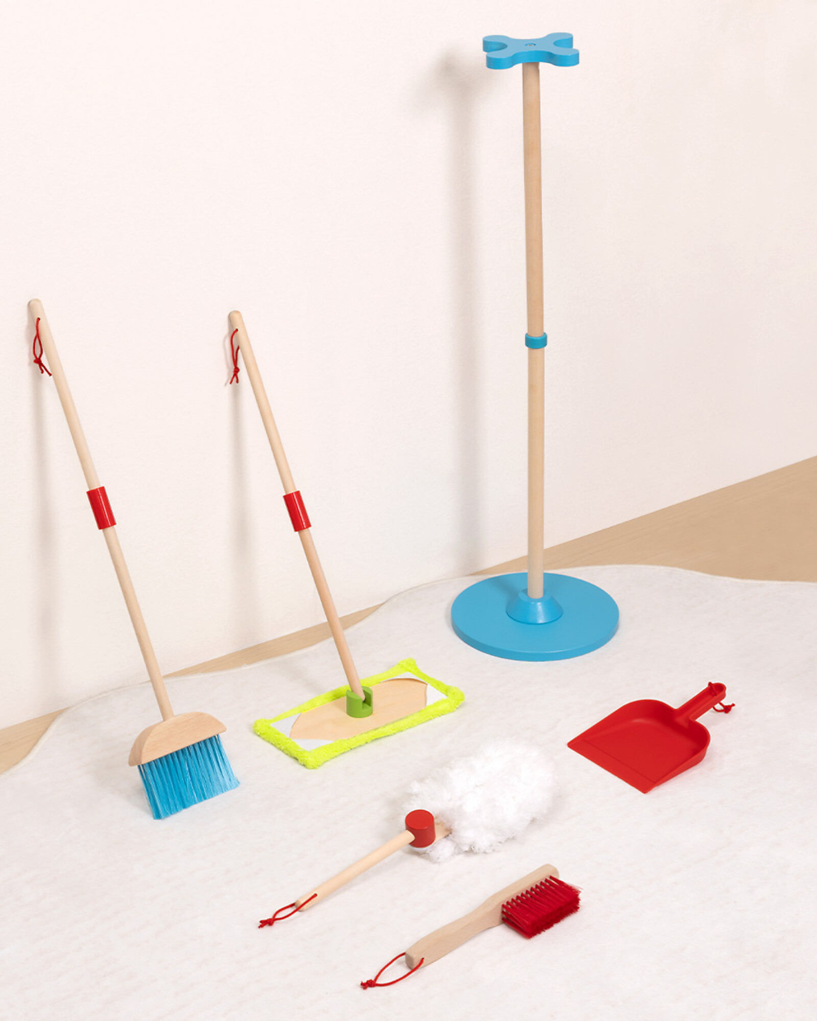 - The 6-piece play set includes: stand, duster, dustpan with brush, broom, mop