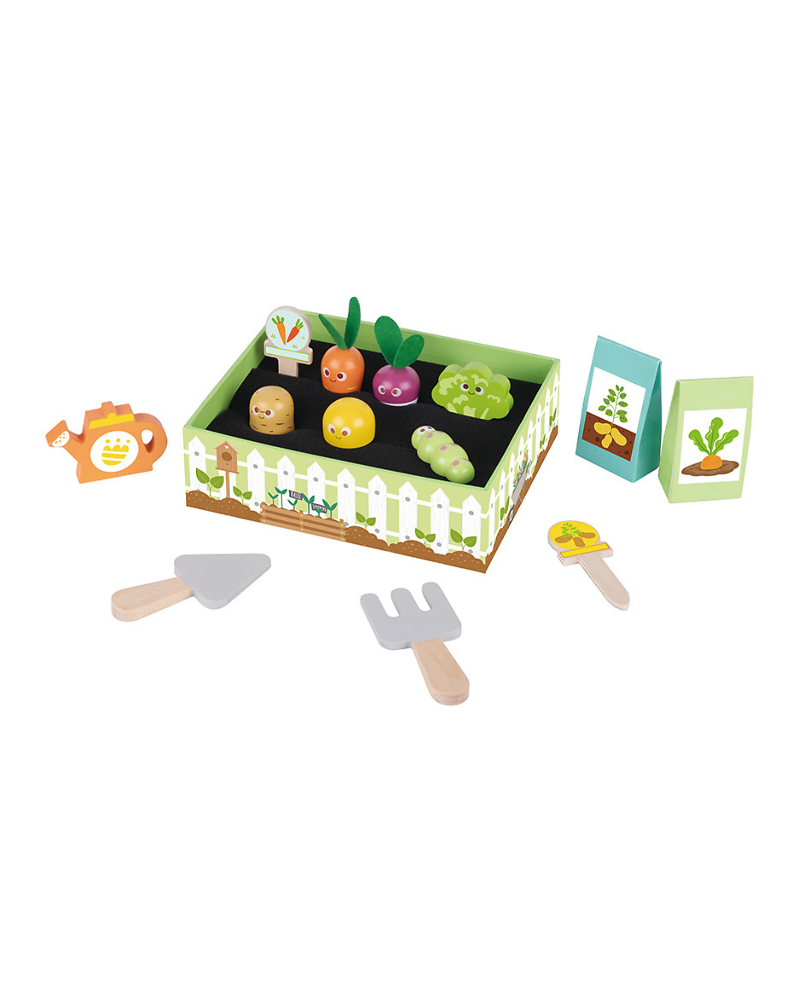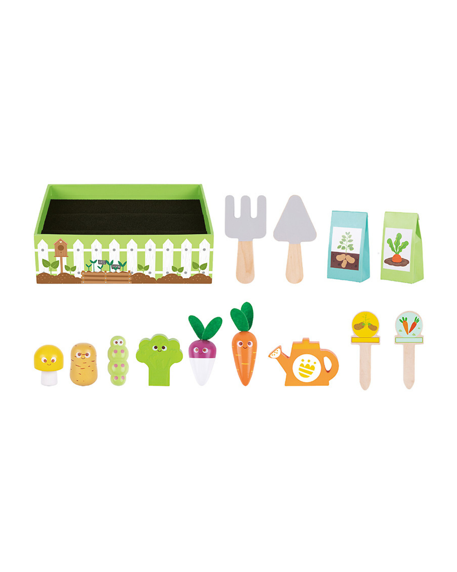 - Wooden vegetables and gardening tools