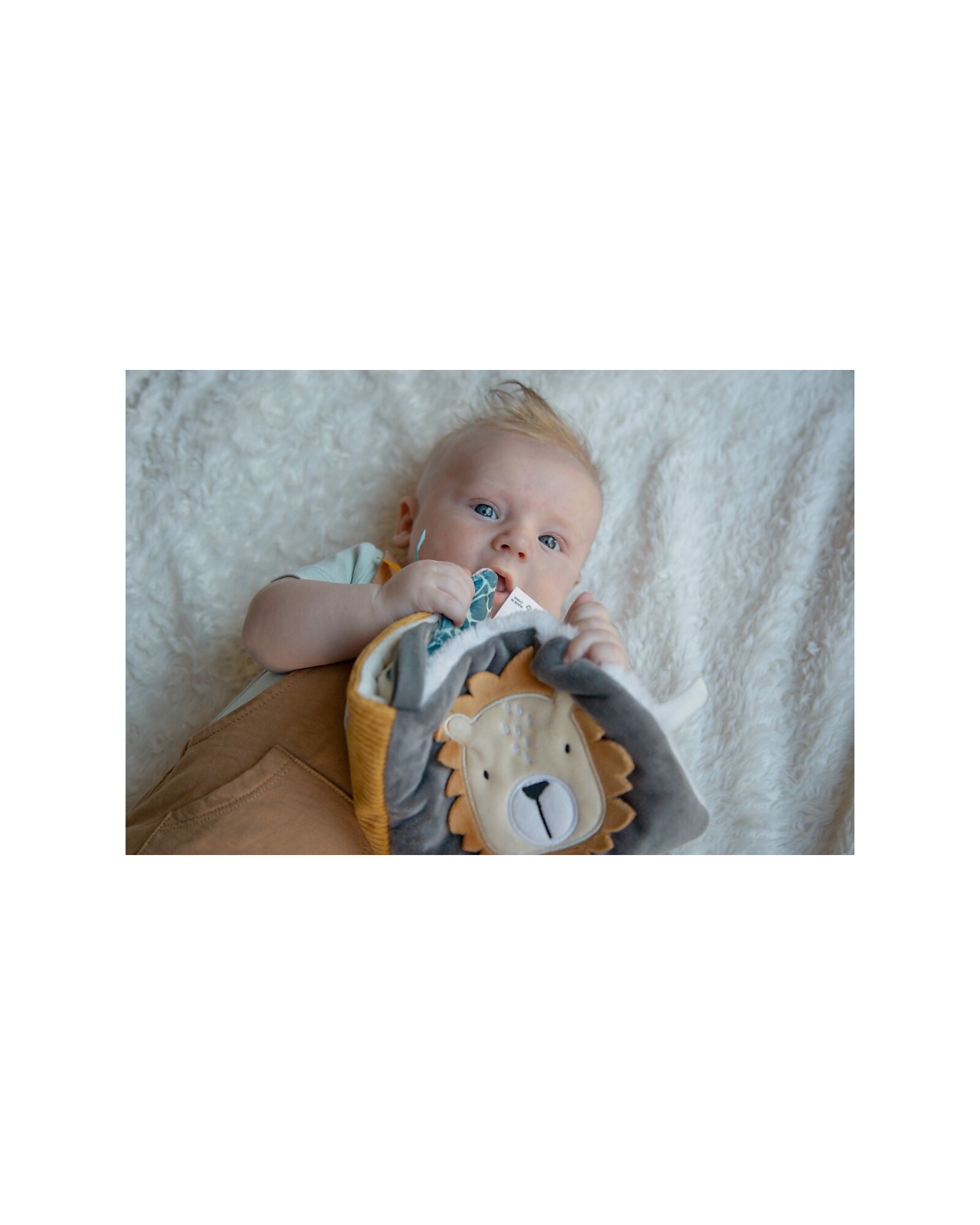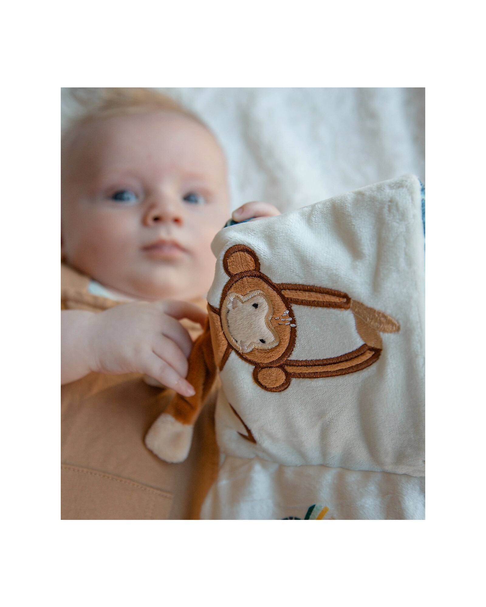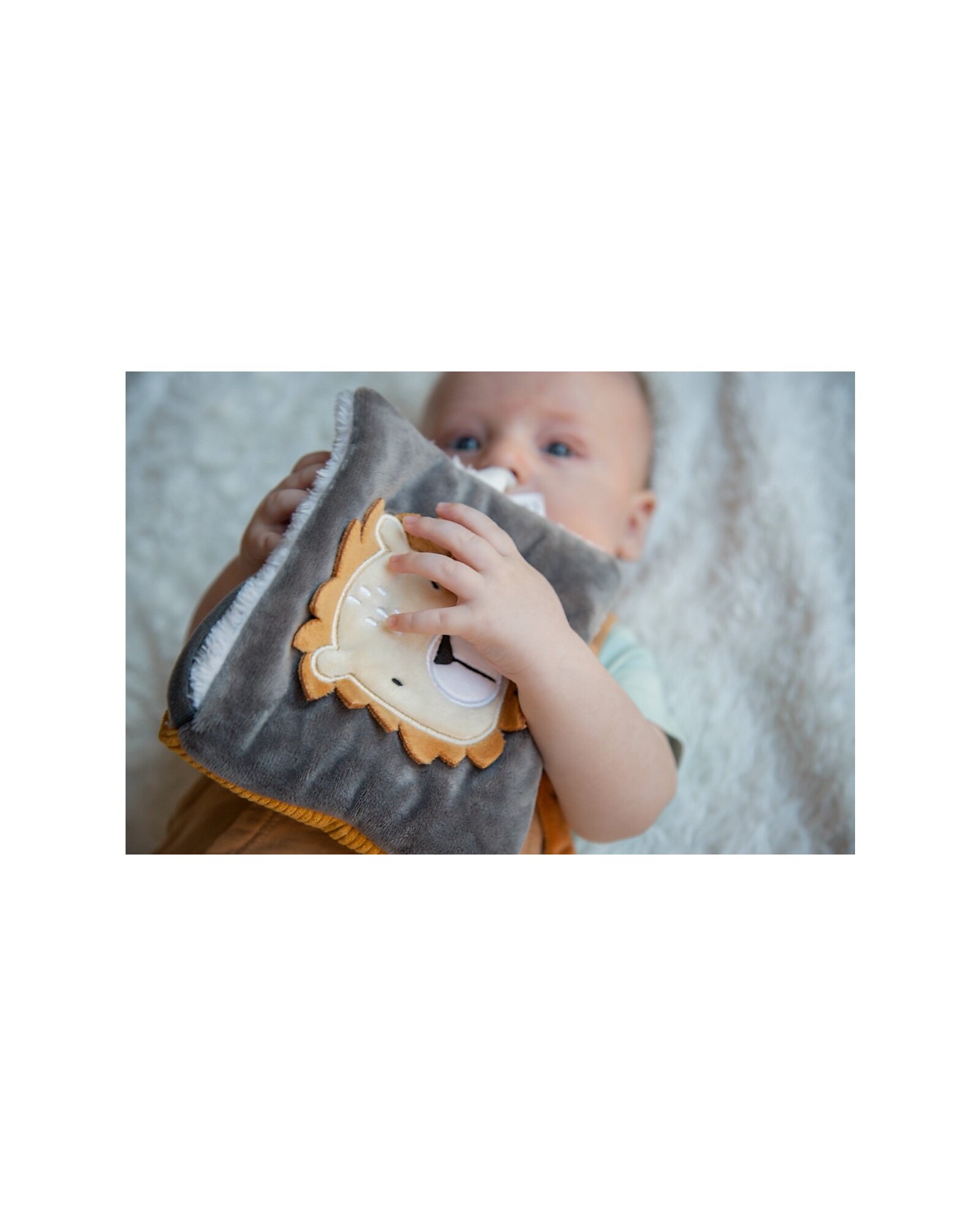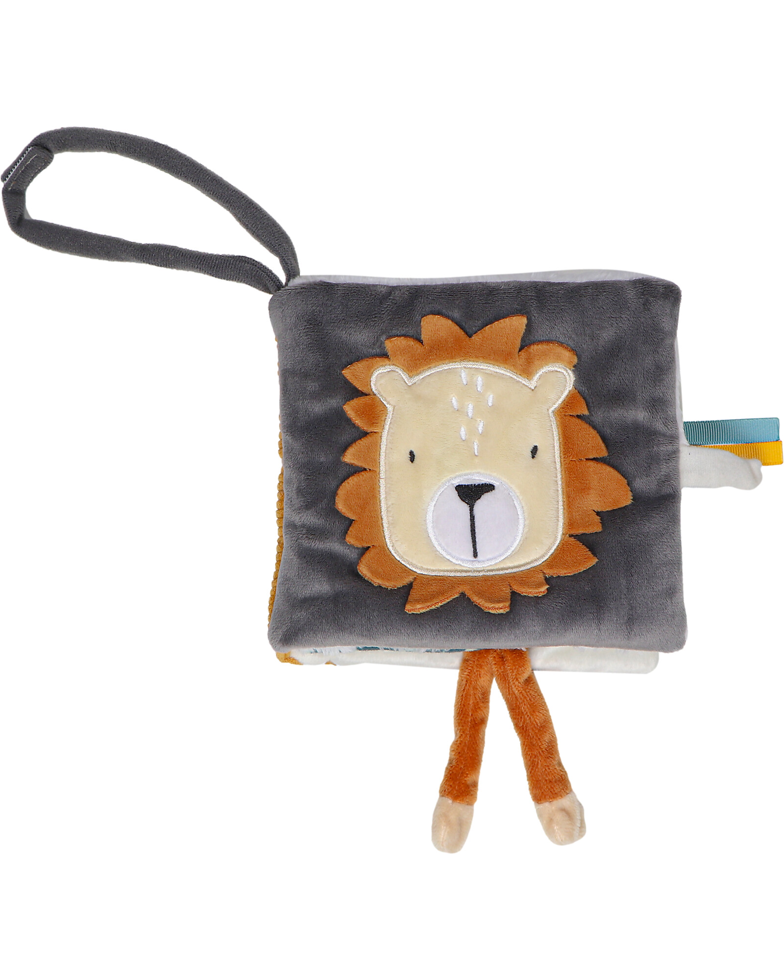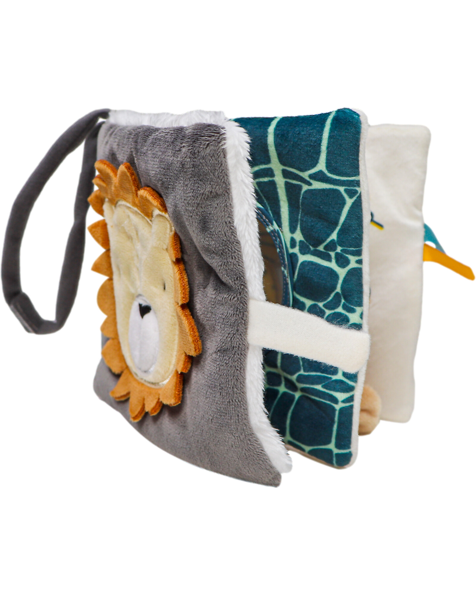 The Activity Book- Jungle is an ideal companion for newborns, designed to stimulate the senses and entertain your baby with fun tactile activities. Made of super soft gray polyester, it is perfect for use on the stroller thanks to the convenient Velcro hook that makes it easy to attach anywhere. Its compact size of 16x16 cm makes it easy to handle and safe for little hands.