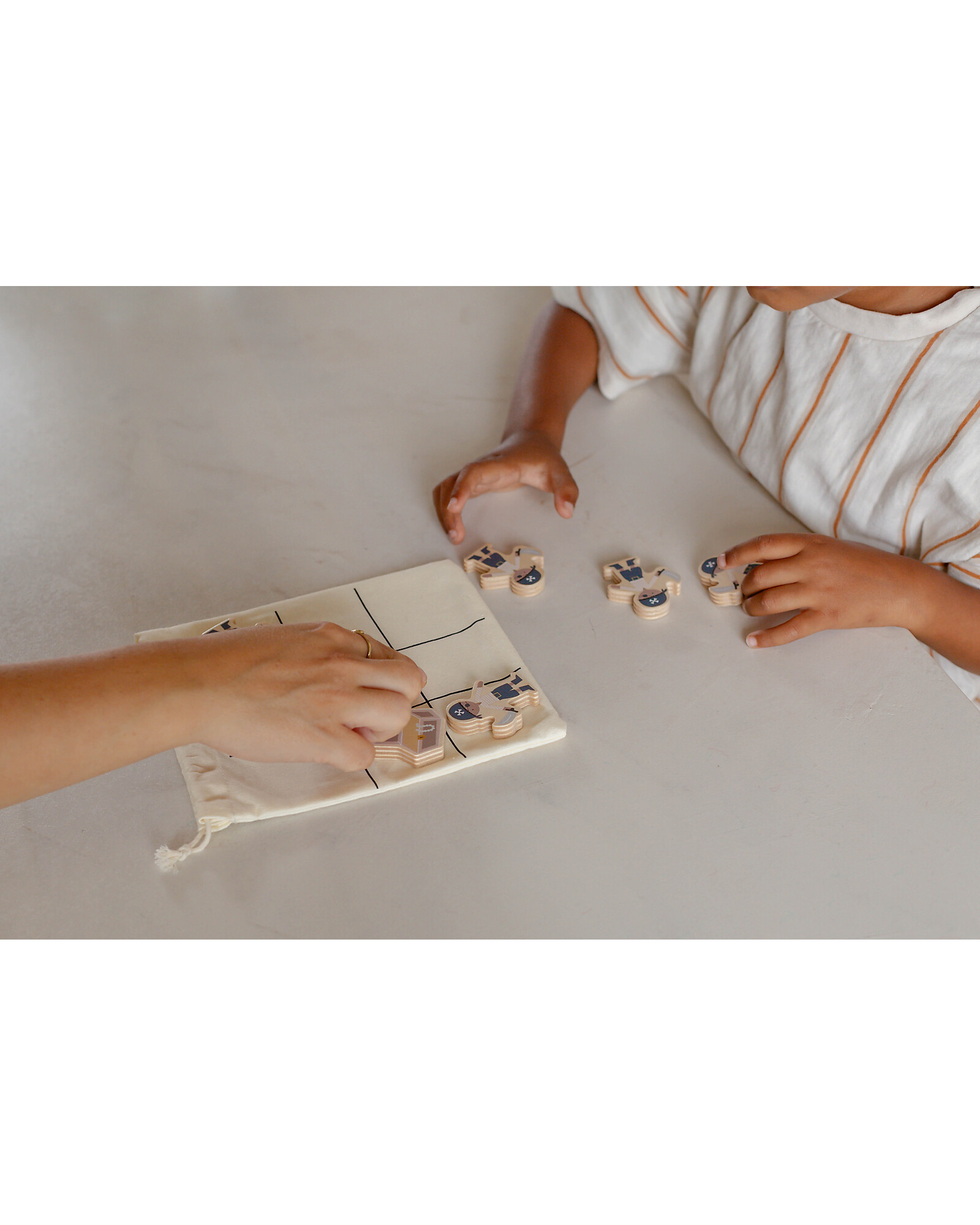 The Wooden Tic-Tac-Toe– Pirate is a creative and eco-friendly take on the classic game, designed to entertain children with a touch of imagination and adventure. Entirely made of wood and finished with non-toxic water-based paints, this game is safe, durable, and pleasant to the touch. The pirate-themed design immediately catches the eye, featuring 5 treasure chests and 5 cheerful pirates as playing pieces. The set also includes a fabric pouch that doubles as a game board and a handy carrying case, making it easy to take the game anywhere—whether to a friend’s house, on vacation, or during travel. Compact, educational, and fun, it’s the perfect way to encourage logic, strategic thinking, and shared play, wherever your little adventurer may go!