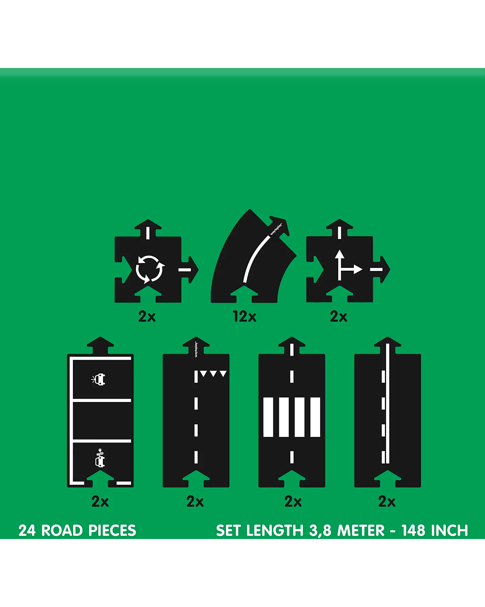 - Includes 24 pieces: 12 curves, 8 straights, 2 intersections and 2 roundabouts.